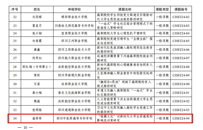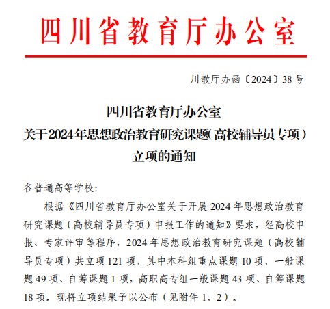 日前,四川省教育厅办公室印发了《关于2024年思想政治教育研究课题(高校辅导员专项)立项的通知》,我院辅导员盛琴琴老师申报的课题获批一般项目课题立项1项,名称:“饭圈文化”对新时代大学生价值观的影响及对策研究。