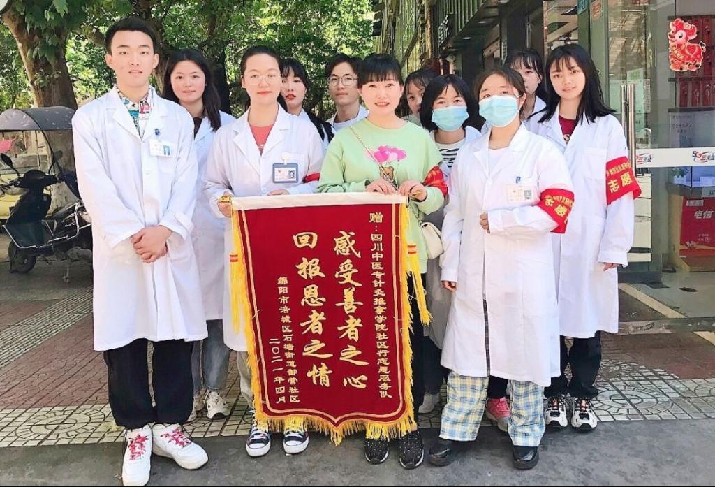“感受善者之心 回报恩者之情 ”,2021年4月24日,绵阳市涪城区御营社区负责人钟莉代表御营社区将红红的一面旌旗赠送给针推学院志愿服务队,感谢医专针灸推拿学院在御营社区志愿服务中提供的关爱和帮助。