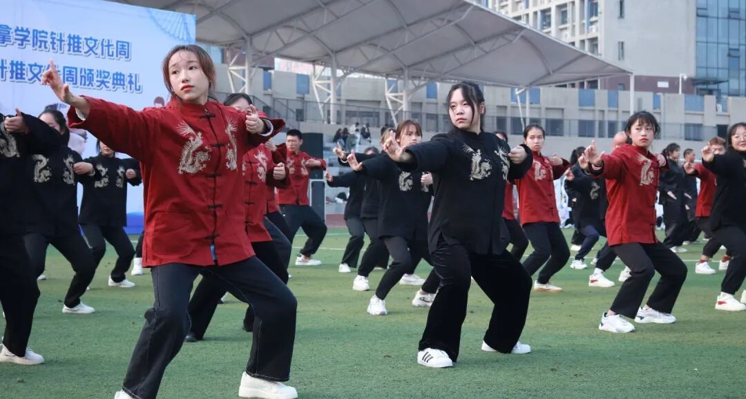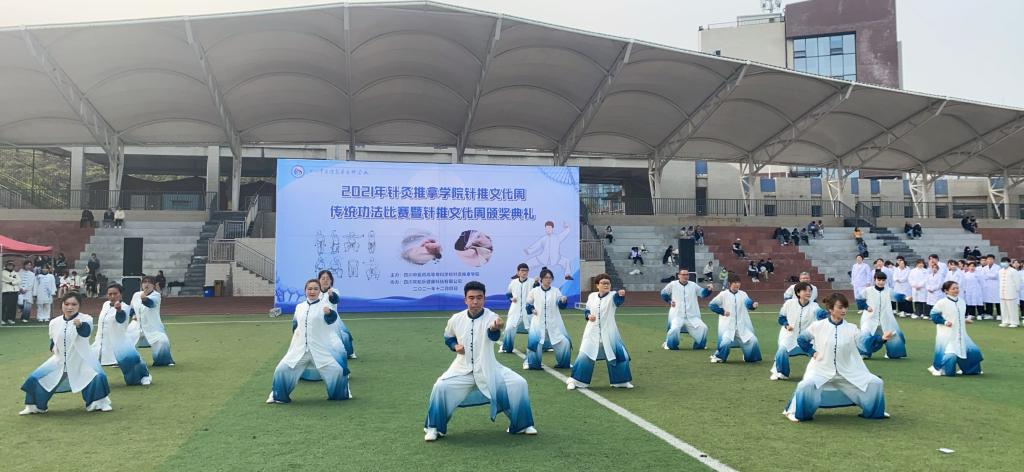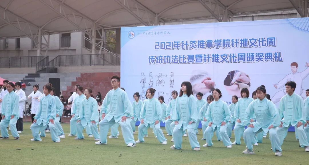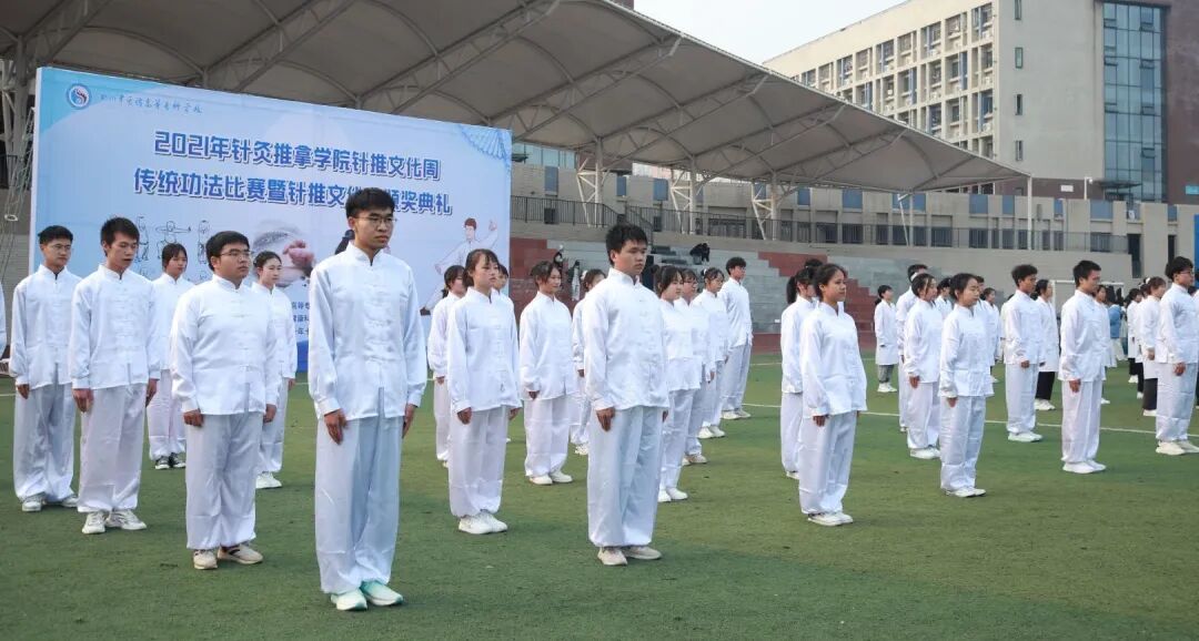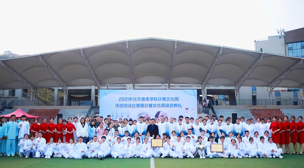 为相应国家实施健康中国行动,促进中医治未病健康工程升级,大力普及中医养生保健知识和太极拳、健身气功(如八段锦)等养生保健方法,推广体现中医治未病理念的健康工作和生活方式的号召,让更多师生成为传统功法的习练者和传播者,2021年12月5日,针推学院在南区足球场举办针灸推拿学院针推文化周传统功法比赛暨针推文化周颁奖典礼,共同感受健身气功和针推文化的特有魅力和文化底蕴。本次大赛由针推学院主办,四川常知乐健康科技有限公司协办。学校党委委员副校长梁晓峰出席活动并致辞,针推学院全体师生参加了此次活动。