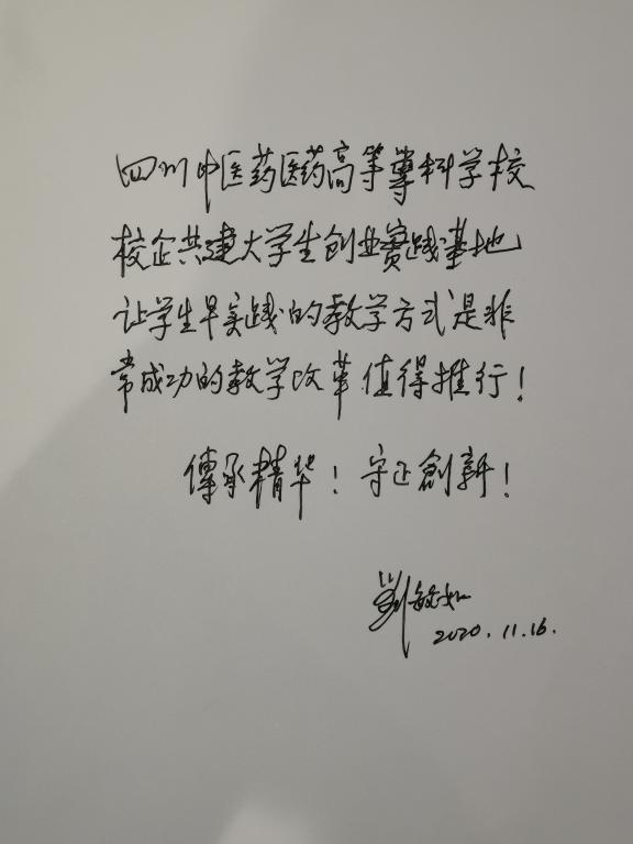18、19、20三个年级近400名学生在该基地进行了实践技能提升及创业实践活动,中心的服务质量深受全校师生好评,参训学生也普遍变得自信,在人际沟通、团队协作、技术实操方面获得明显提升。自投入使用以来,各级领导多次来该基地参观及指导工作,国医大师刘敏如教授来基地参观后也欣然题词,该基地已经成为我校职业教育的一张靓丽名片。
