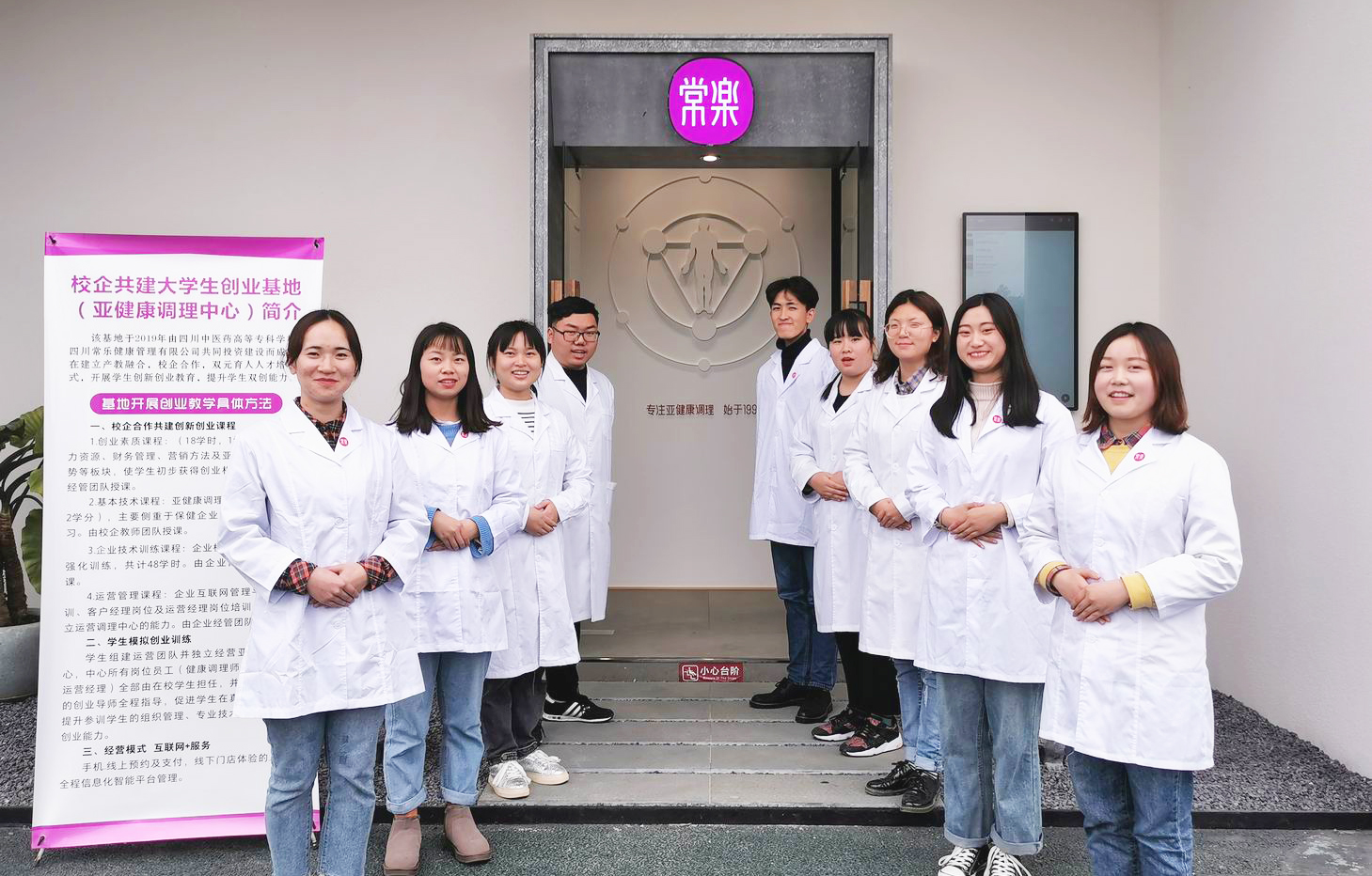 自“国家职业教育改革实施方案”明确提出进一步促进产教融合、校企“双元”育人要求后,我校针对康养领域专业人才极度缺乏及高职康养专业群创新创业教育普遍重理论、轻实践的现状,与四川常乐健康管理有限公司于2019年深度合作,双方共建大学生创业实践基地-亚健康调理中心,将其作为创新创业实践平台无偿提供给校内康养相关专业学生使用。调理中心内所有岗位(健康调理师、客户经理、运营经理)全部由在校学生担任,面向全校师生提供以推拿为主系列亚健康调理服务。校企双方共同组织筛选、培训和考核参与该项目的学生。