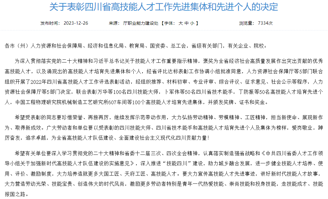 热烈祝贺我院获得由四川省人力资源和社会保障厅 四川省经济和信息化厅 四川省教育厅 四川省政府国有资产监督管理委员会 四川省总工会5大部门联合表彰的四川省2022年“高技能人才培育先进集体”荣誉称号,感谢全体老师的辛勤付出与共同努力。未来我院全体同志定珍惜荣誉、再接再厉,继续发挥示范带动作用,大力弘扬劳动精神、劳模精神、工匠精神,担当新使命、展现新作为、取得新成效!