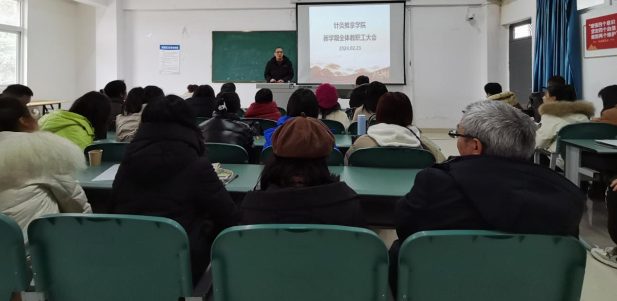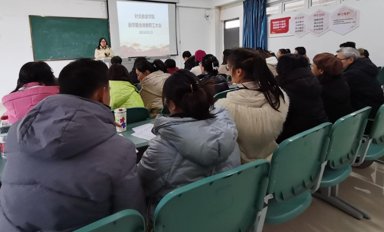 2月23日下午2点,针灸推拿学院2024年春季学期全院教师大会在第四实训楼5-15举行。会议旨在总结过去一年的工作,明确新学期的工作目标和任务,落实责任。针灸推拿学院蒋永忠院长、王巧利副院长、熊华书记以及全院教师参加了大会,会议由蒋永忠院长主持。