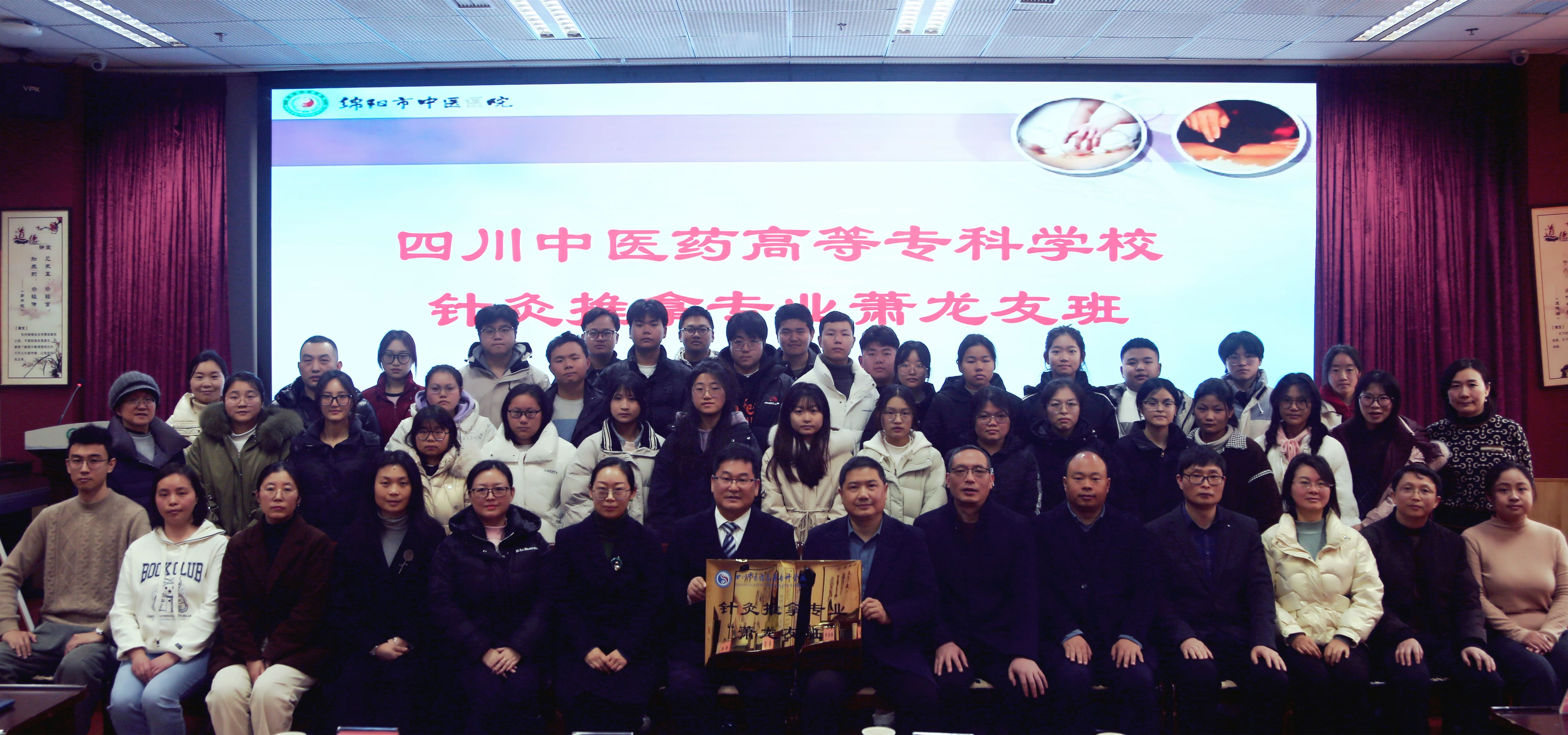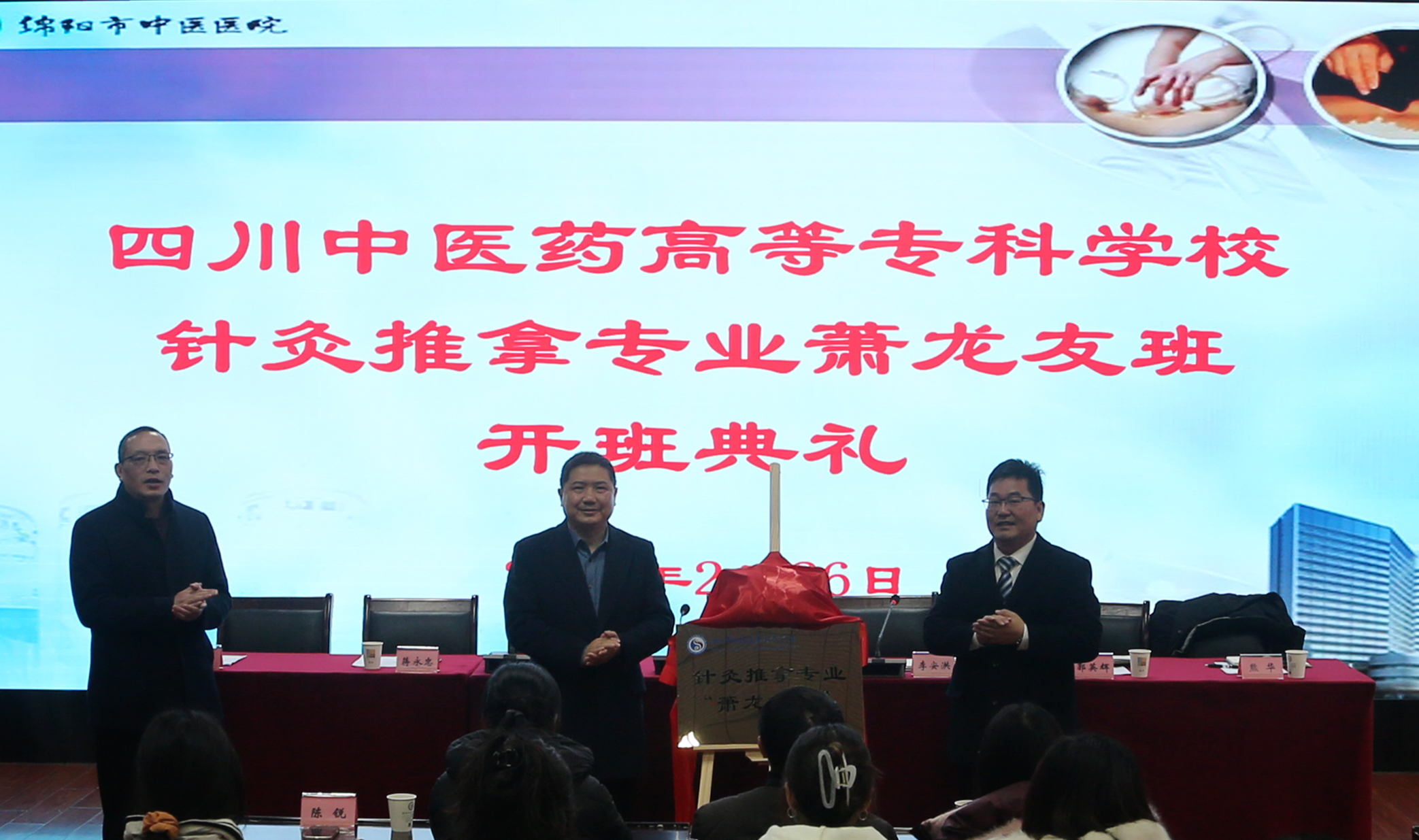 2月26日上午9时许,由我院2022级针灸推拿专业33名学生组成的“萧龙友”全程教学班开班仪式于绵阳市中医医院怀恩楼中和厅顺利举行。出席此次开班仪式的人员有我校党委委员、副校长梁晓峰,医院党委委员、副院长李安洪,以及双方相关部门负责人、教师代表、辅导员及全体学生。