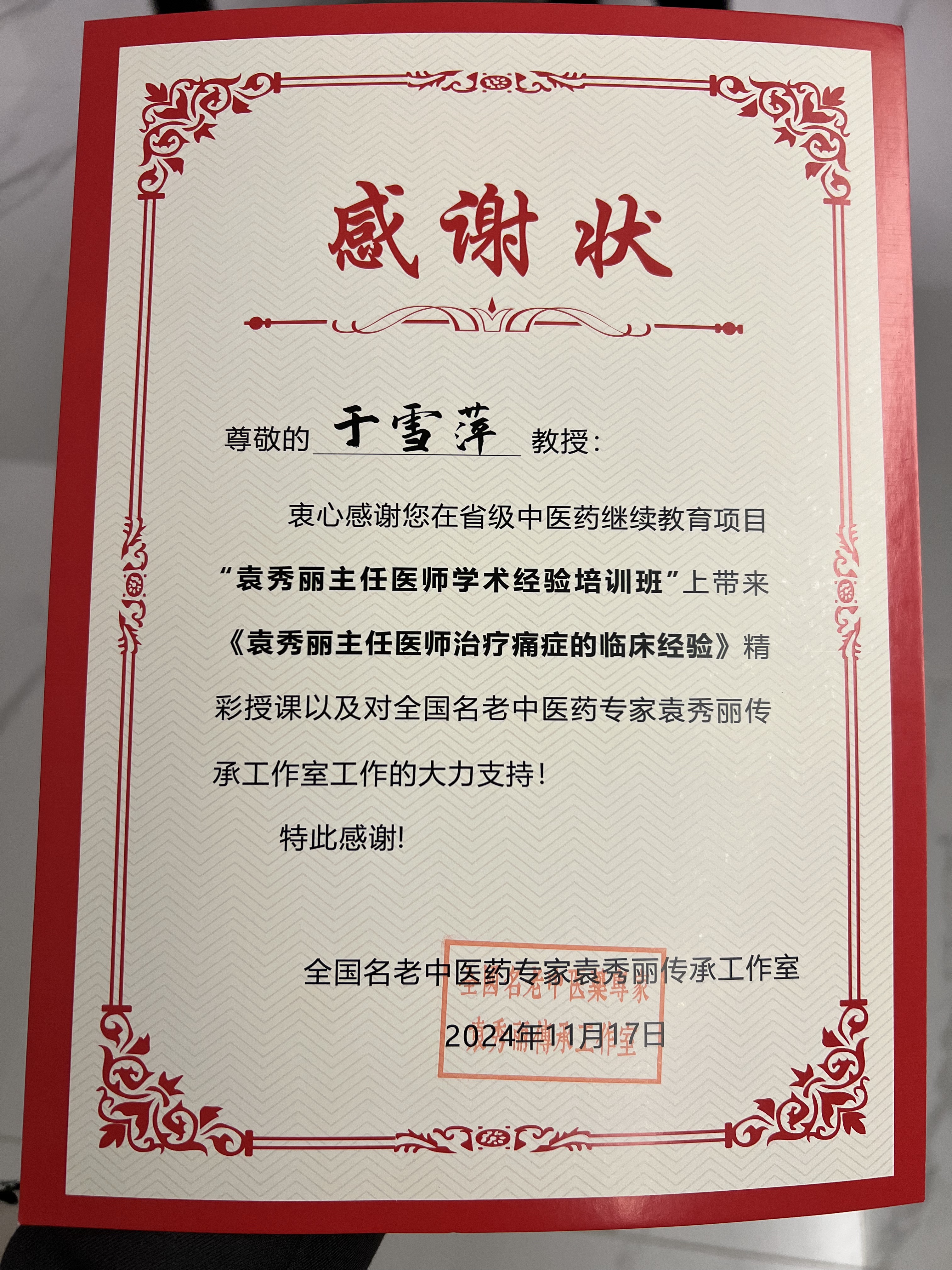 于雪萍老师围绕袁秀丽主任医师的医德医风、学术思想和临床经验,引经据典地对袁秀丽老师治疗痛症的临床经验进行了归纳总结,强调了经典学习的必要性、科研的创新性和终身学习的重要性,讲座内容受到了与会专家的一致认可。