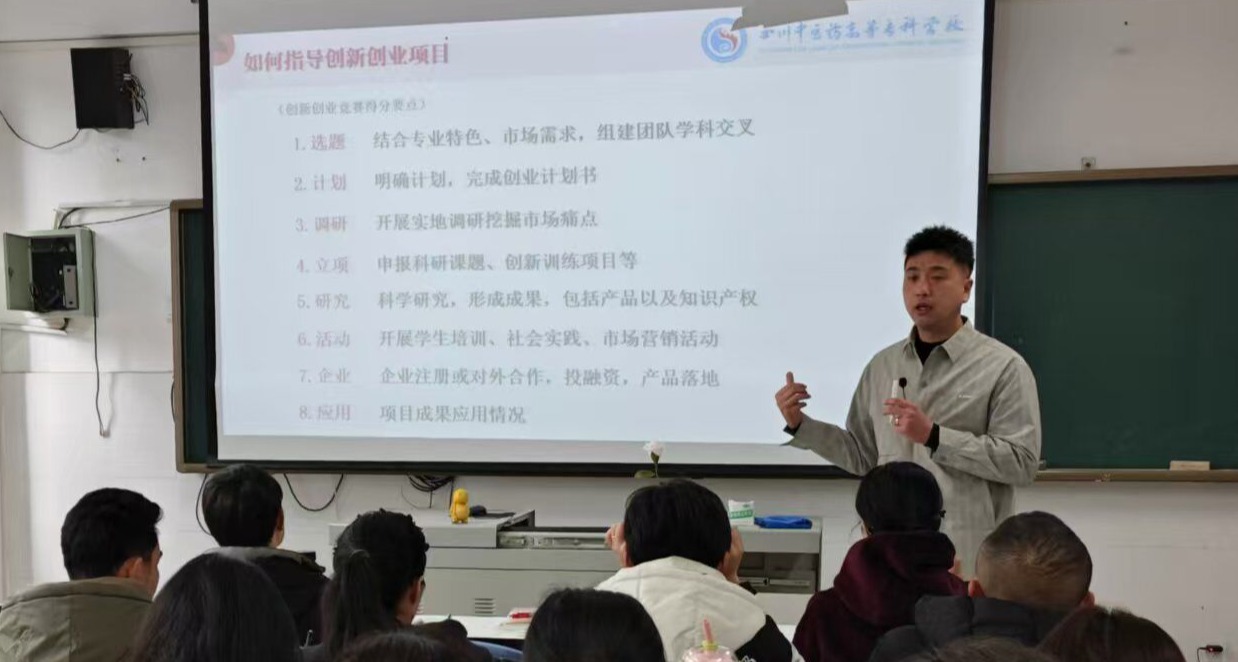 首先,阎凌翔老师以《教师学生高质量参与创新创业竞赛路径》为题详细讲解了如何通过选题、计划、调研、立项、研究、活动、企业注册及应用等步骤,高质量地指导学生参与各类创新创业竞赛,强调通过结合专业特色与市场需求,组建跨学科团队,可有效提升项目的创新性和实用性。并列举了学校和涪城区政府为创新创业学生提供的多项支持措施,为党员教师们指导学生参与创新创业竞赛提供了清晰的路径。