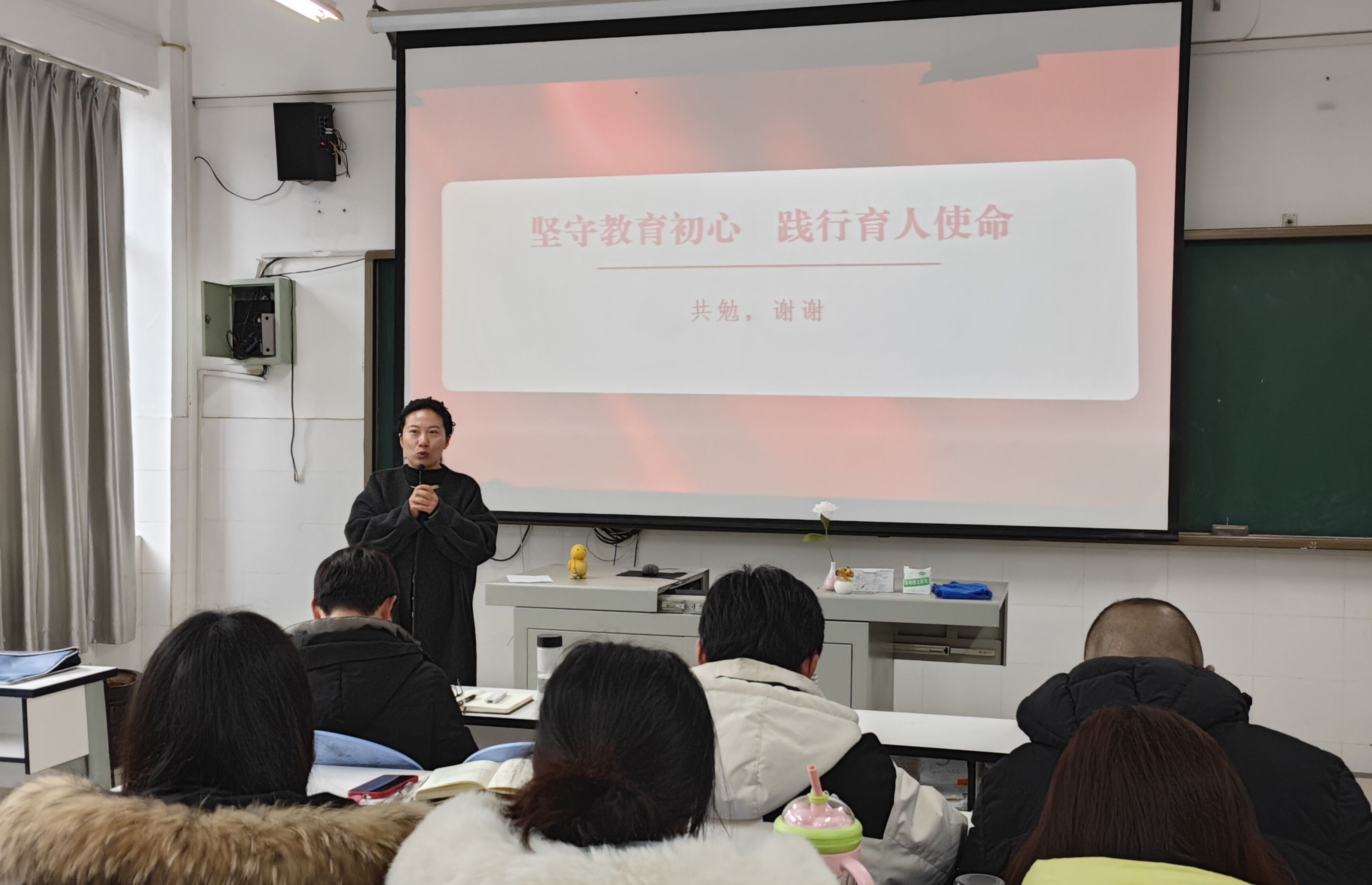 第二环节,党总支书记熊华以《坚守教育初心、践行育人使命》为题为全体党员展开了一堂生动的党课。他首先回顾了习近平总书记近年来关于师德师风的重要论述,强调了高校教师作为人类灵魂的工程师所承担的神圣使命。并结合蔡元培、陶行知、张伯苓等教育家讲述了什么是教育家精神,鼓励大家要有大爱大智大德,终身学习、关爱学生、公正无私并积极创新。最后,重申了新时代高校教师职业行为十项准则,要求全体党员教师在实际工作中,要关心爱护学生、潜心教书育人、坚持言行雅正、秉持公平诚信、坚守廉洁自律并积极奉献社会。