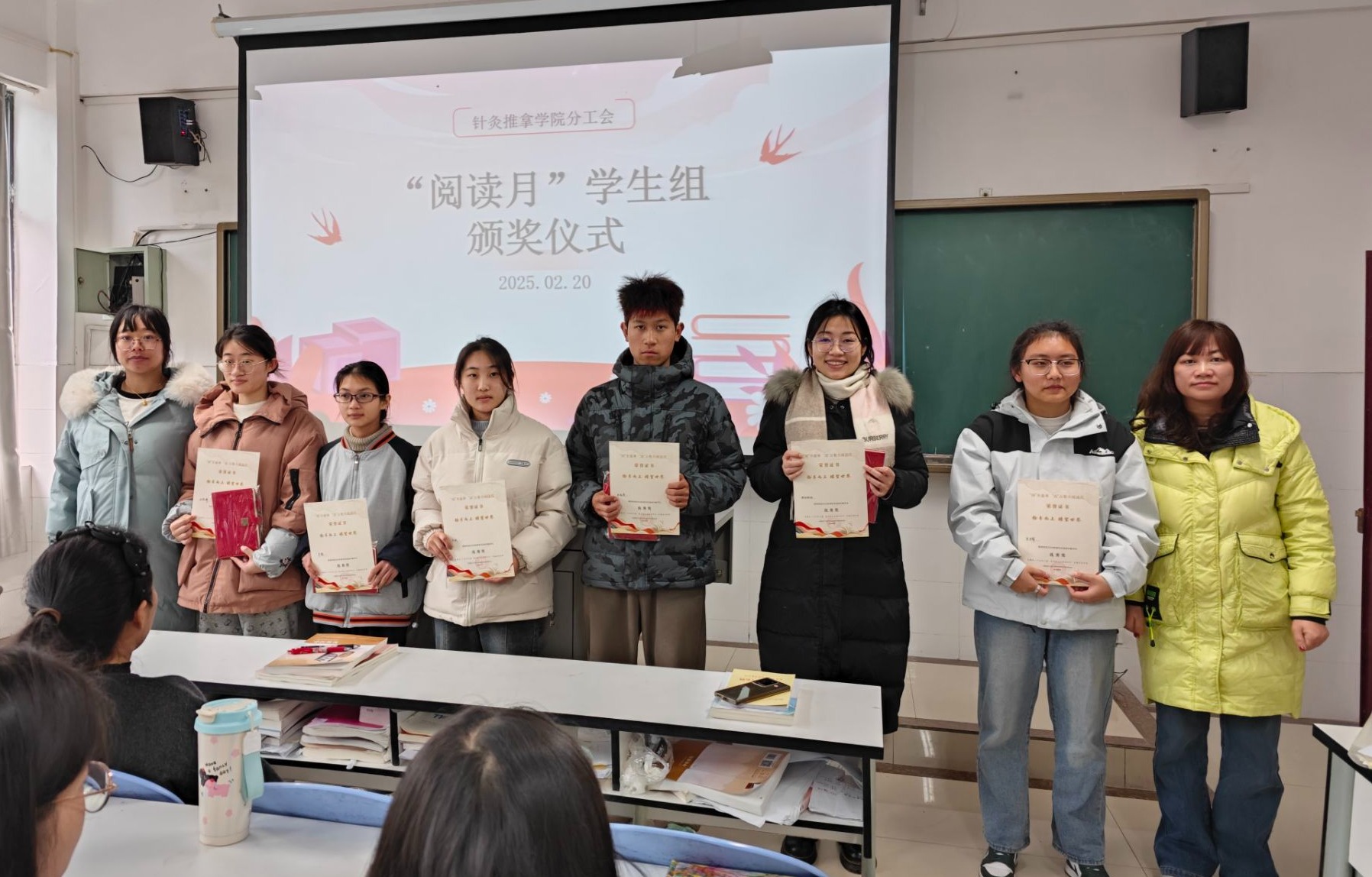 2月20日中午,针灸推拿学院分工会在南园6教203教室隆重举行了“阅”享盛世·“读”占鳌头线上阅读月学生组颁奖仪式。本次颁奖仪式由分工会委员梁莹主持,分工会主席熊华、分工会委员朱霜菊、梁莹及辅导员廖霞、钟好雪两位老师出席并为获奖学生颁奖。