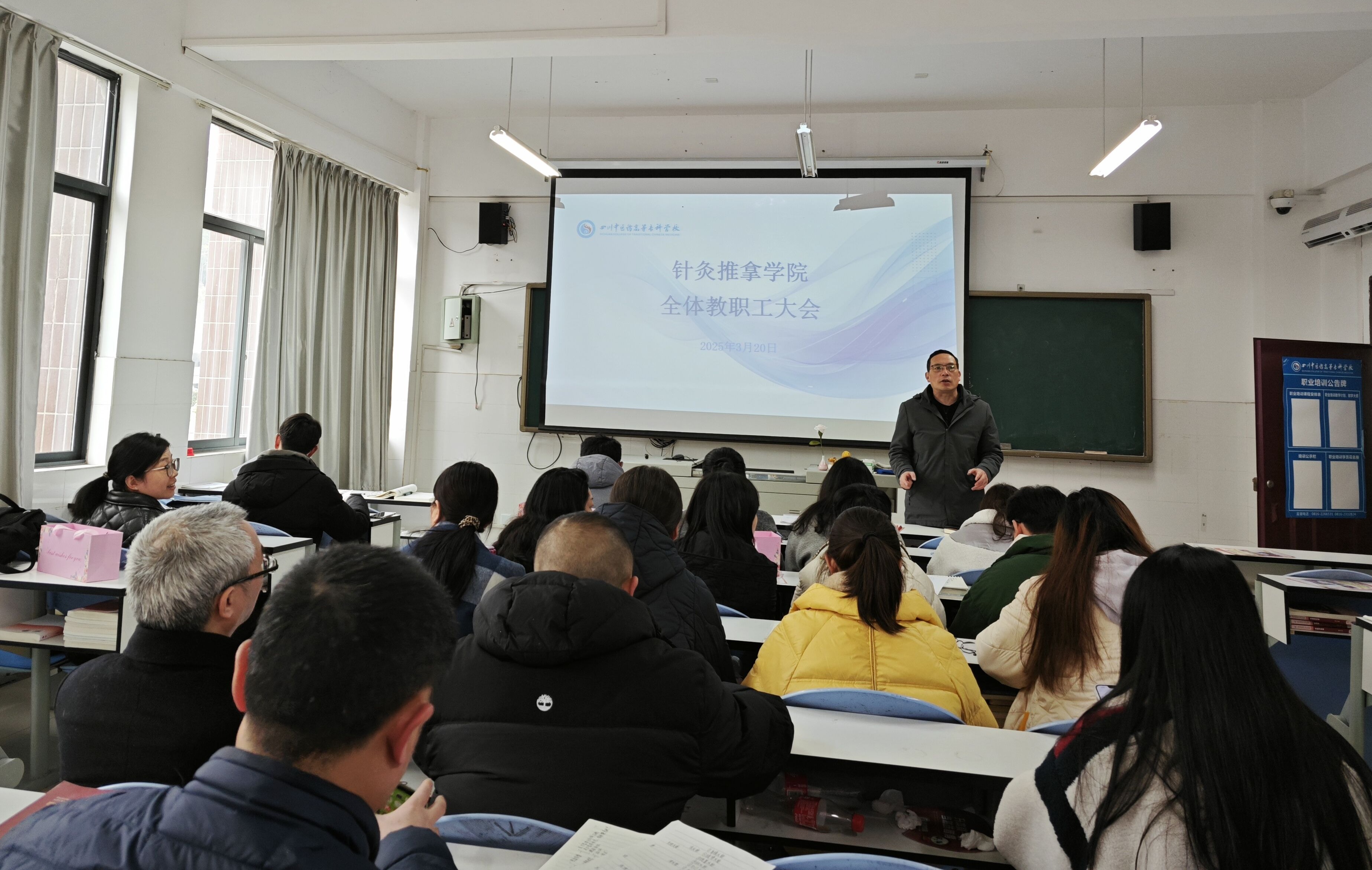 3月20日下午,针灸推拿学院在学校南园6教203召开了2025年春季学期第二次全体教职工大会。会议由院长蒋永忠主持,学院全体教职工参加。
