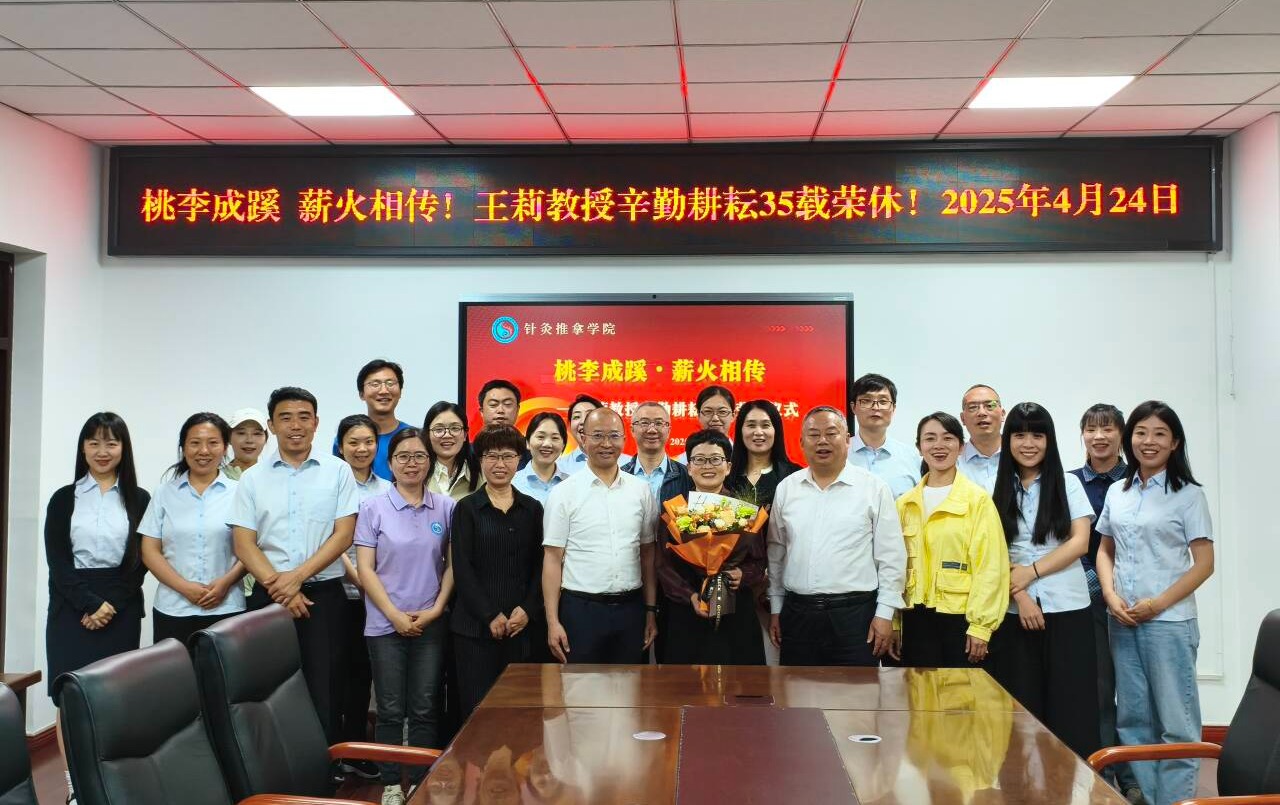 4月24日中午,针灸推拿学院分工会在南园综合楼315会议室为在教学岗位辛勤奉献35载的王莉教授举办了一场温馨的荣休仪式。仪式由院长蒋永忠主持,校长李祥、校党委副书记商碧辉、校人事处处长林芝及全院专兼职教师共同见证了这一温馨而荣耀的时刻。