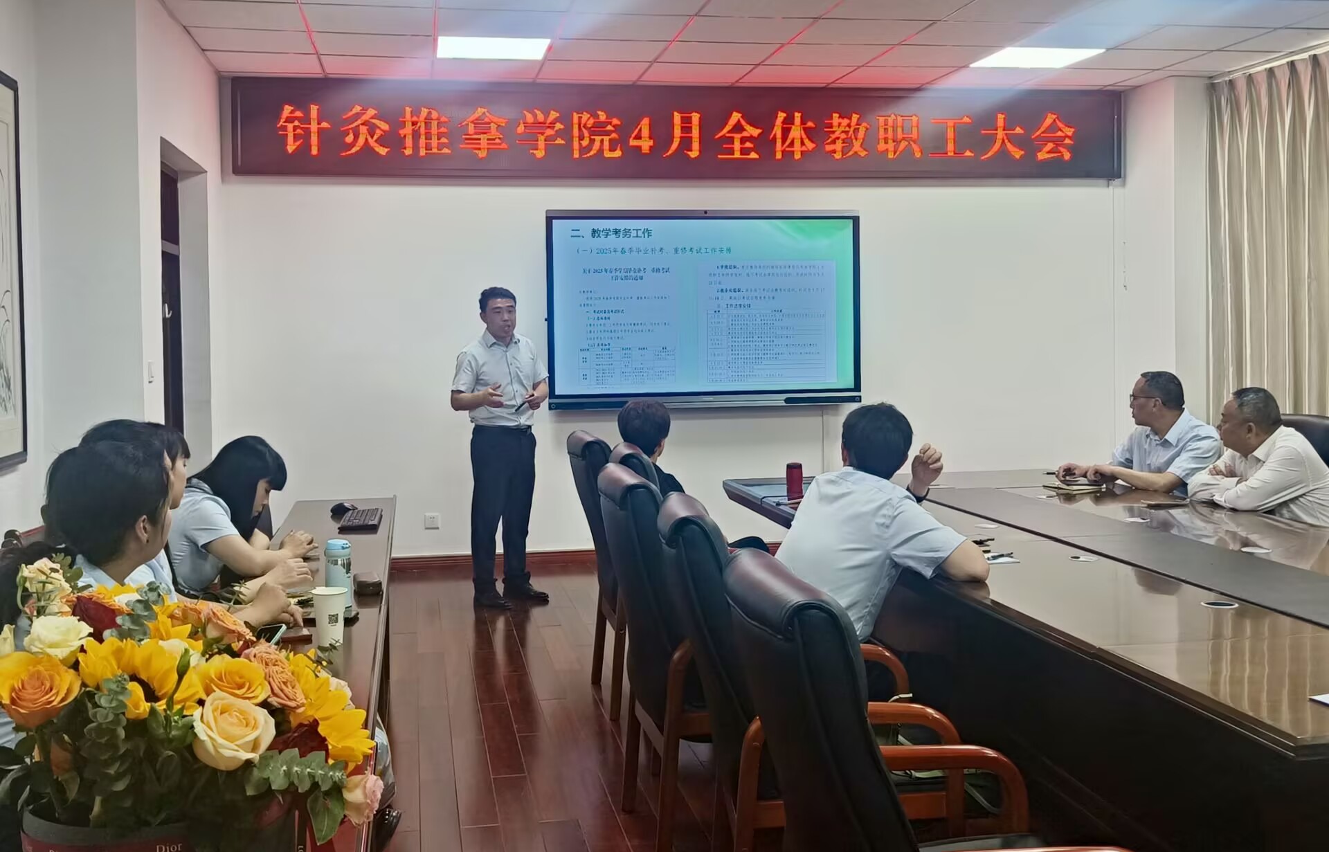 4月24日下午,针灸推拿学院在学校南园综合楼315召开了本学期第三次全体教职工大会,会议由院长蒋永忠主持。