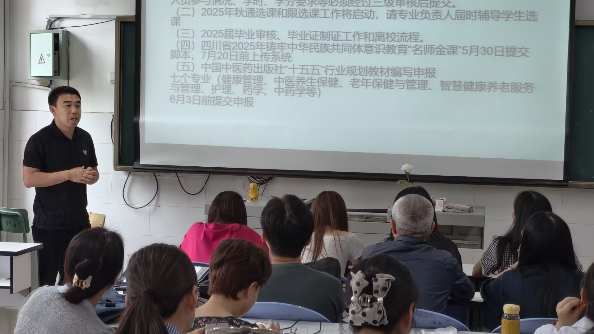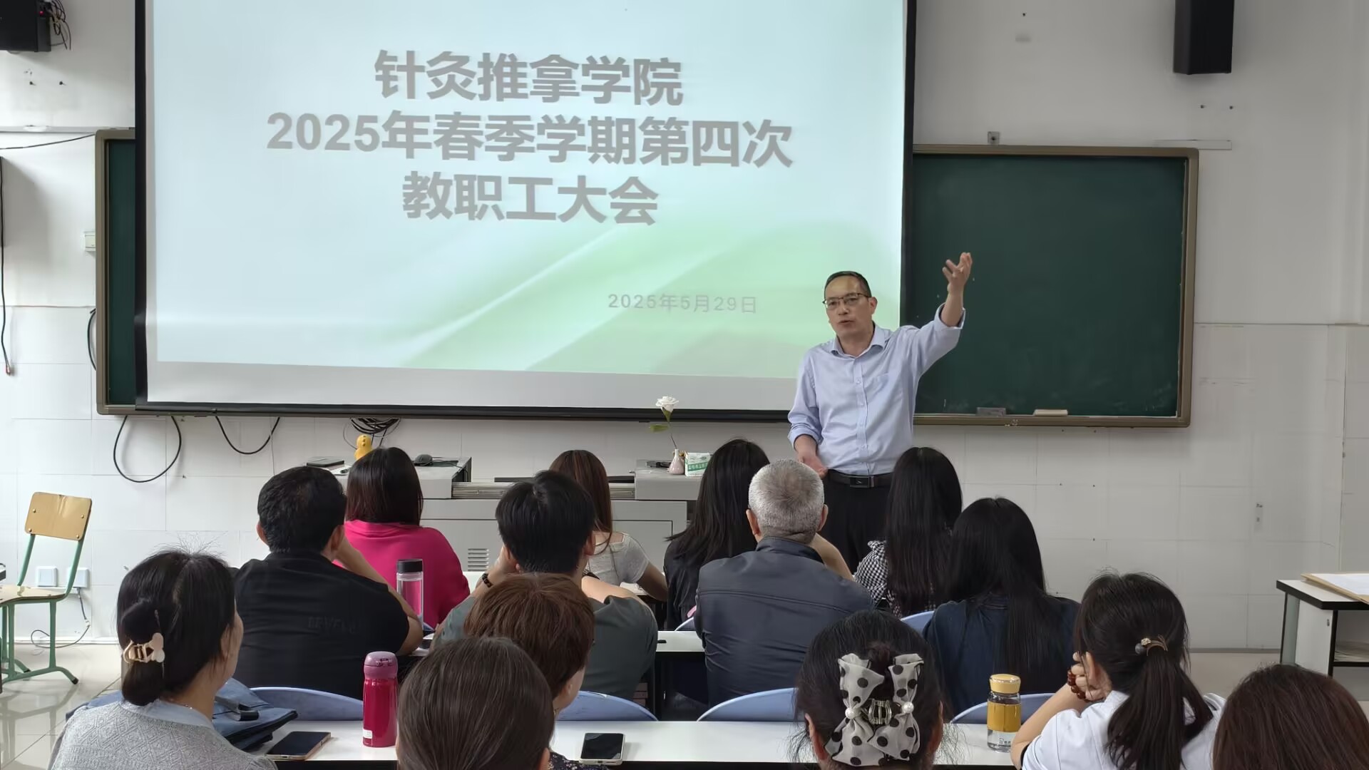 5月29日下午,针灸推拿学院在南园6教203召开了2025年春季学期第四次全体教职工大会,院长蒋永忠主持会议。