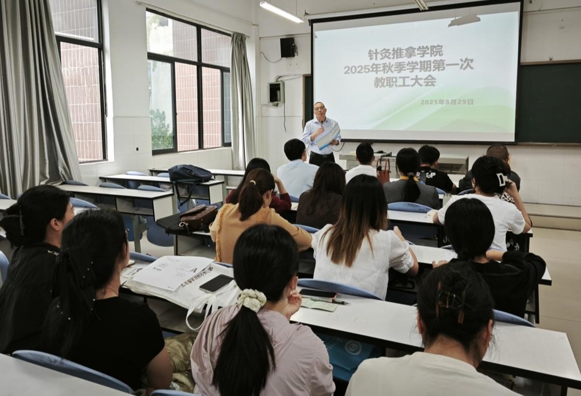 8月29日上午,针灸推拿学院召开了2025年秋季学期第一次全体教职工大会,院长蒋永忠主持会议。