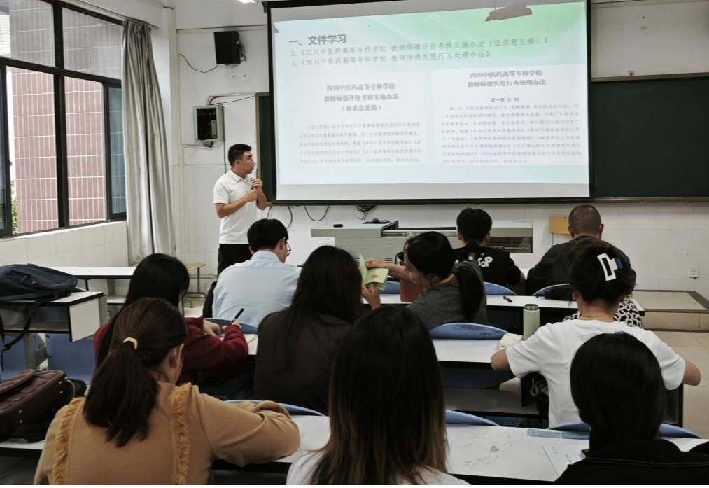 副院长周宏宇领学了《中华人民共和国国家通用语言文字法》和《四川中医药高等专科学校 教师师德失范行为处理办法》等重要文件。他在领学中强调,良好的师德师风和规范使用国家通用语言文字,是教师落实立德树人根本任务的基本要求,也是教育教学质量的重要保障。随后,他围绕新学期教学工作、教改科研项目推进以及教学资料收集整理等具体任务,作出了系统部署,确保新学期各项工作有序高效开展。