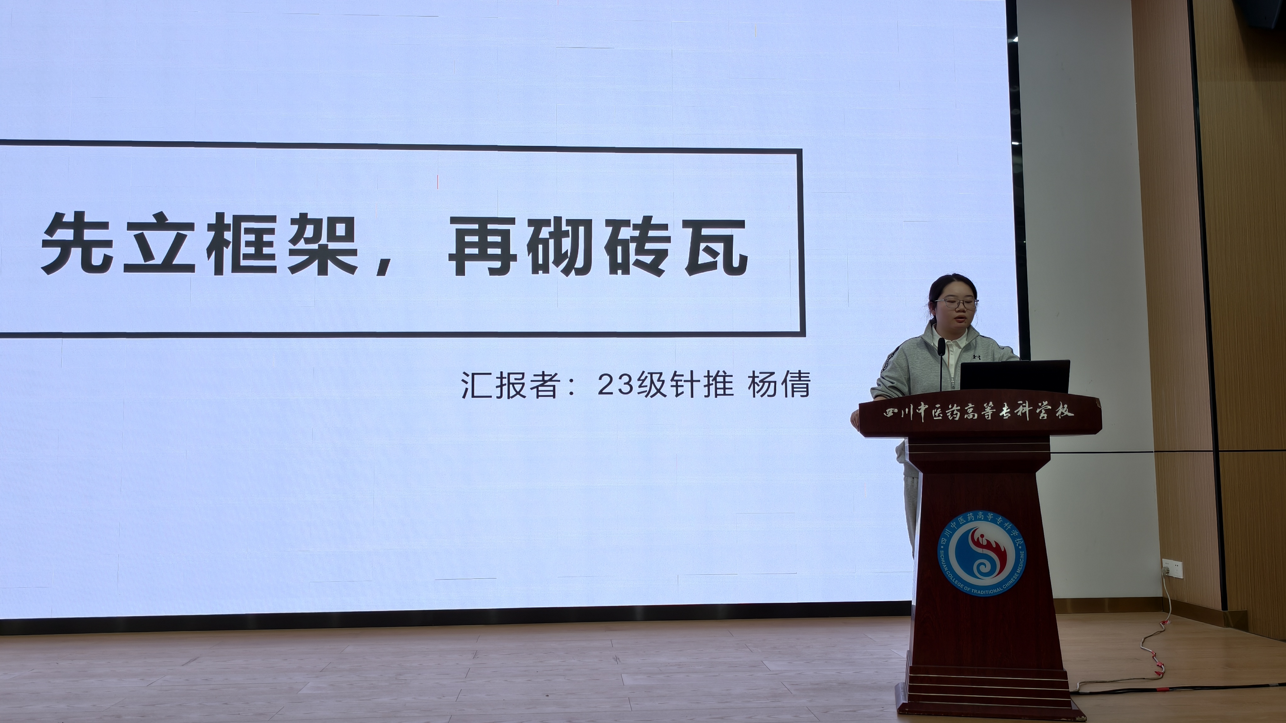 王教授也邀请我院针灸推拿专业大三学生杨倩以《先立框架,再砌砖瓦》为题,分享了跟随她学习经典中医理论的过程与感悟。