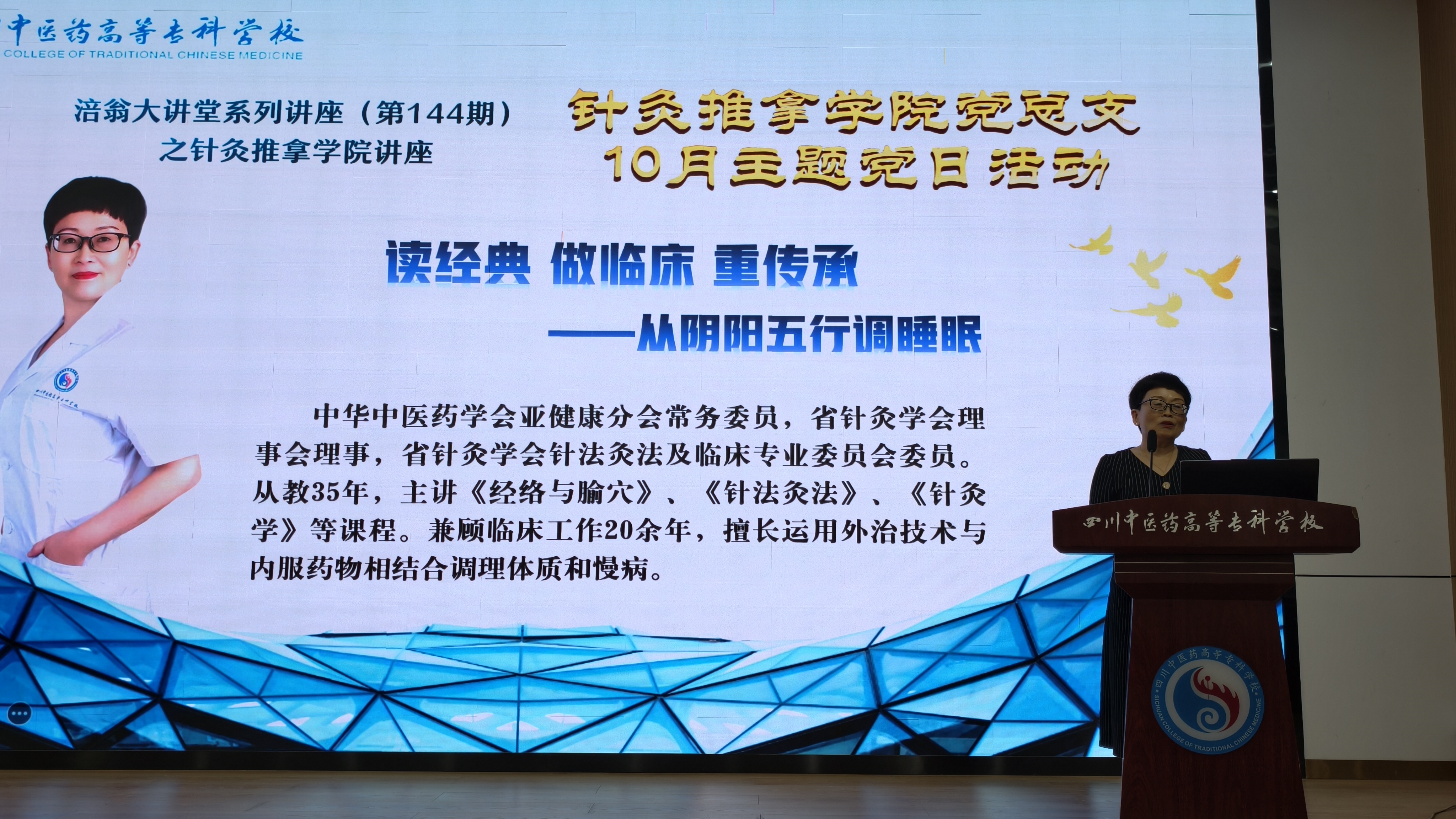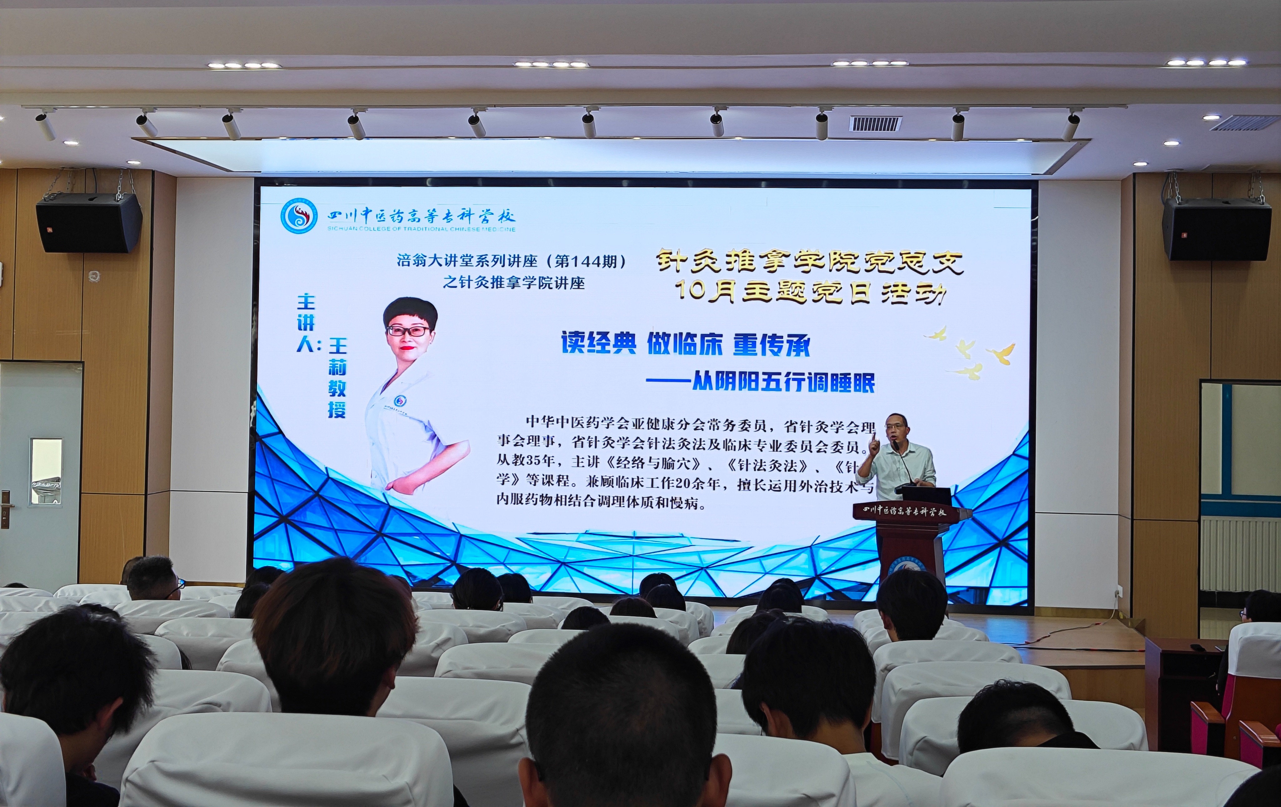为将党建和业务深度融合,提升党员专业素养与教学科研能力,针灸推拿学院党总支以 “经典传承·学术领航”为主题于10月16日在北区一教学术厅开展当月主题党日活动,邀请学院资深教师王莉教授以《读经典 做临床 重传承—从阴阳五行调睡眠》为题开展学术讲座,全体党员和各专业年级同学踊跃参加。