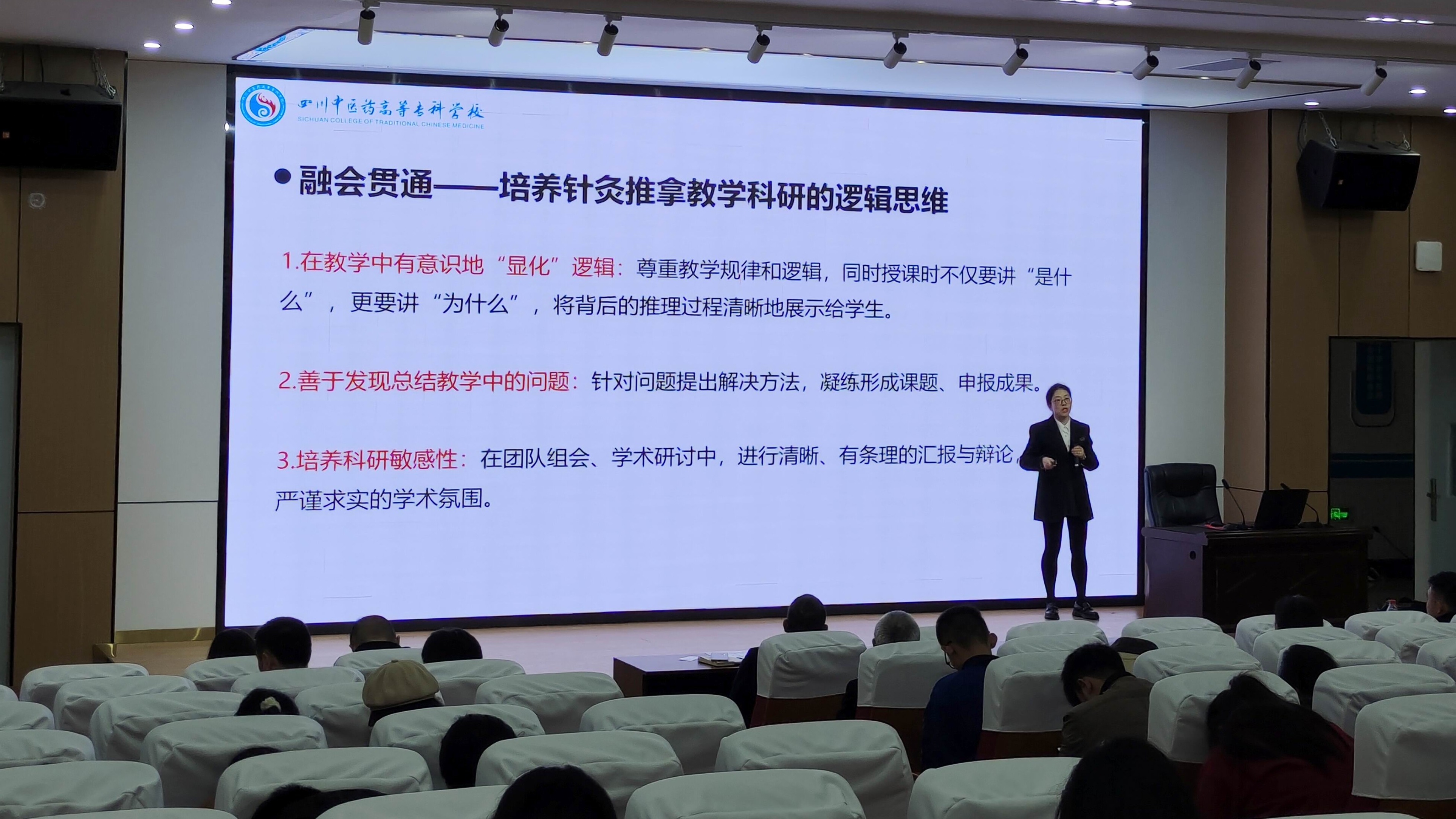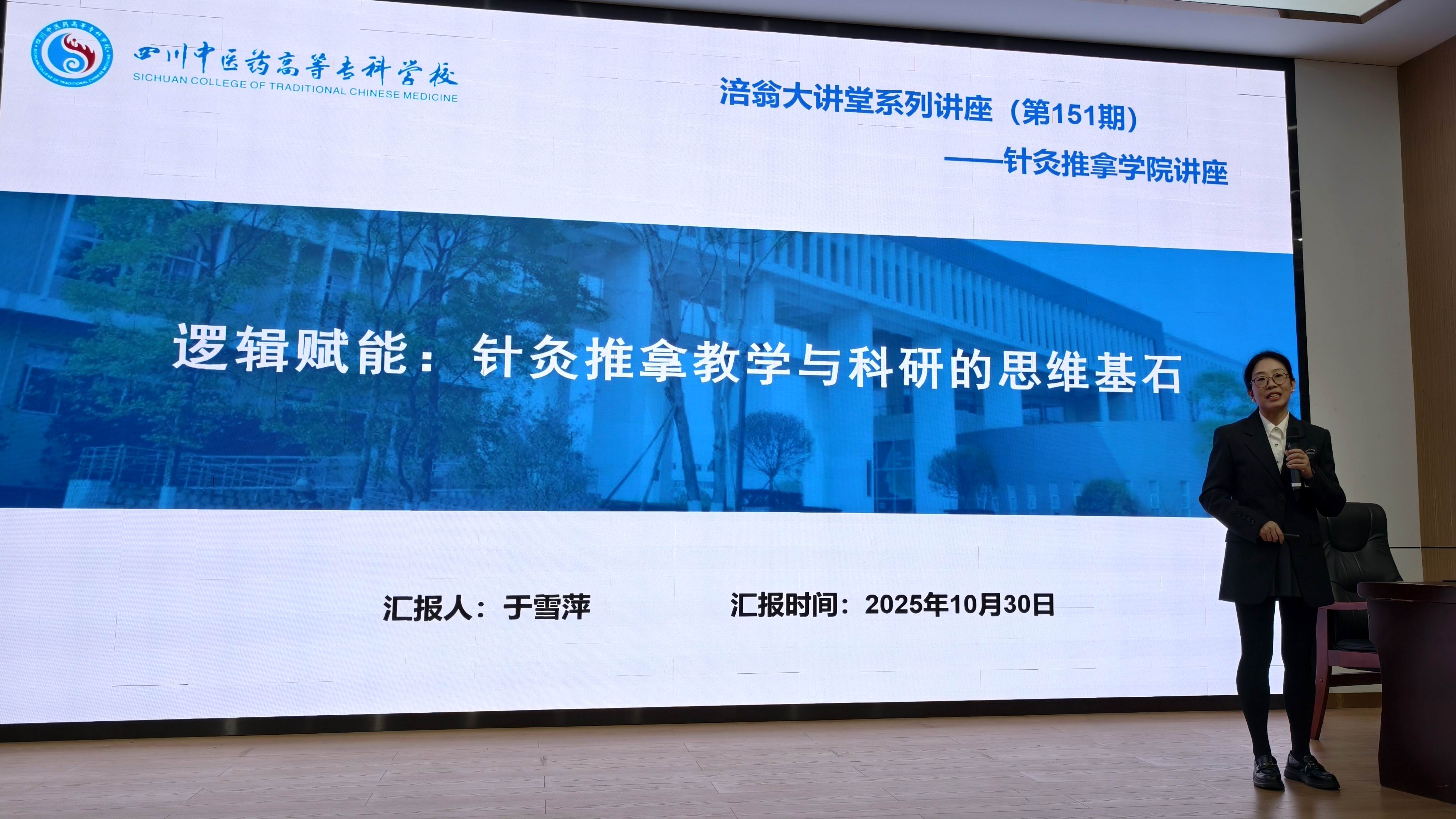 为夯实我院师生教学科研的思维基石,推动针灸推拿学科建设与人才培养提质增效,10月30日下午,针灸推拿学院在北园1教学术厅举办涪翁大讲堂系列专题讲座,我院针灸推拿专业负责人于雪萍副教授以“逻辑赋能:针灸推拿教学与科研的思维基石”为题开讲,学院全体教师及学生代表近200人现场参会。