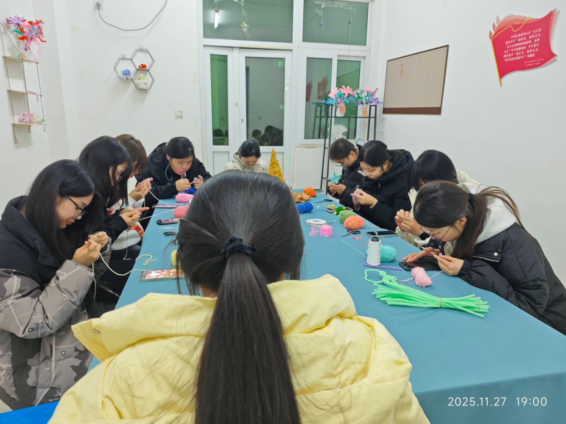 每周四下午,女工部成员早早到场筹备,热情迎接每一位参与同学。活动现场,暖黄灯光下各色毛线与钩针整齐摆放,同学们围坐一堂,从生疏试探到熟练编织,时而专注钻研针法,时而交流创作思路,难题面前既有专业人员耐心指导,也有同伴热心分享,欢声笑语中,一个个精致的针织作品逐渐成型,不仅让大家解锁了新技能,更收获了珍贵友谊与满满成就感。