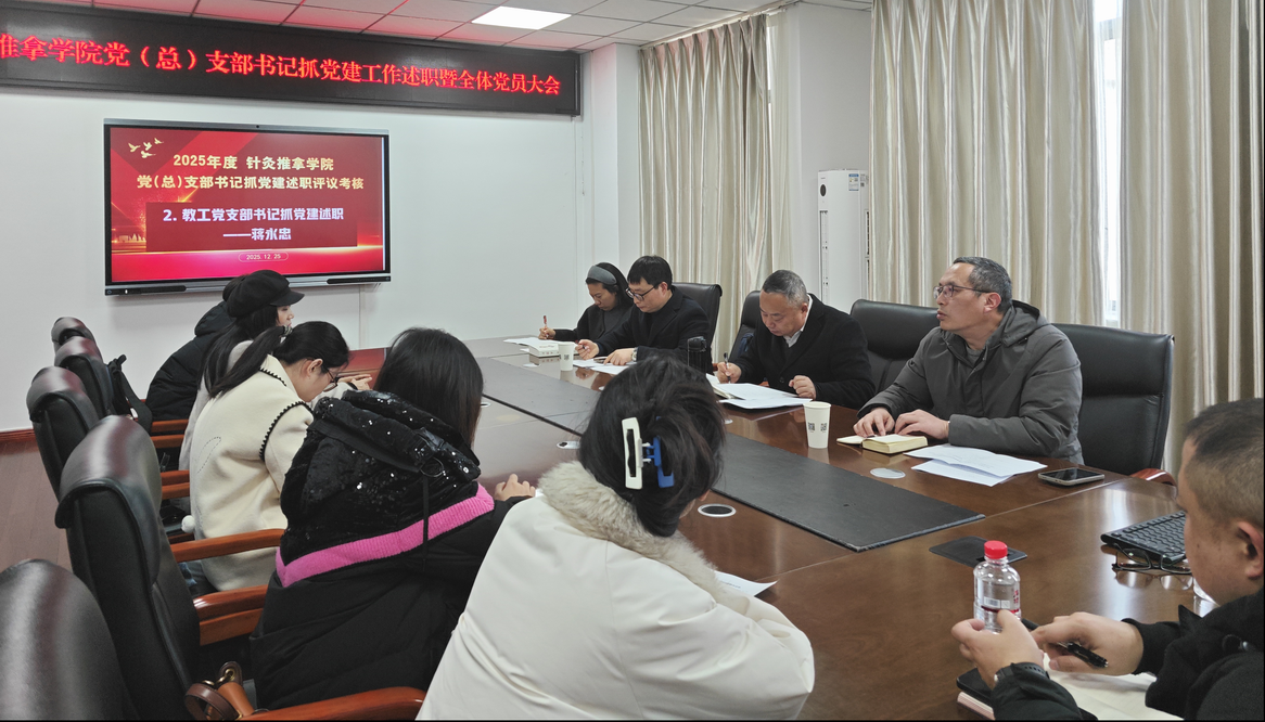 为深入学习贯彻习近平新时代中国特色社会主义思想,全面落实上级党组织决策部署,扎实推进党建工作提质增效,12月25日下午,针灸推拿学院党总支在综合楼315会议室召开2025年度党(总)支部书记抓基层党建述职评议大会,会议由党总支书记熊华主持,校党委副书记商碧辉出席并指导工作,全体党员及师生代表参加。