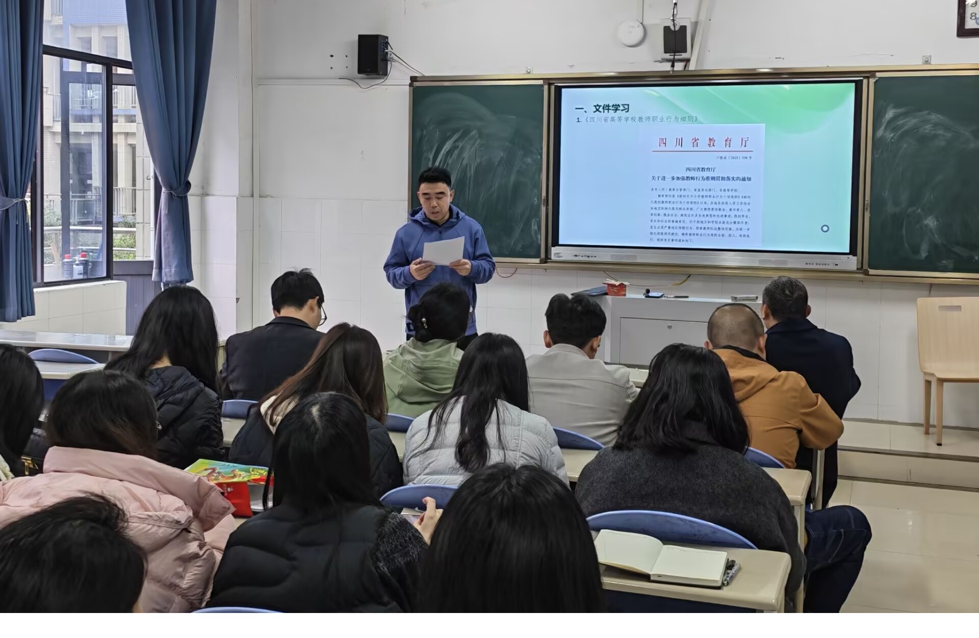 副院长周宏宇组织全体教职工专题学习《四川省高等学校教师职业行为细则》和《四川中医药高等专科学校教学差错和教学事故认定及处理办法(修订)》,强调全体教师要严守师德底线,规范从教行为。随后,他围绕新学期教学工作进行具体部署,重点就常规教学运行、教改科研项目推进以及教学资料的收集整理等任务作出安排,要求各教研室和任课教师提前谋划、狠抓落实。