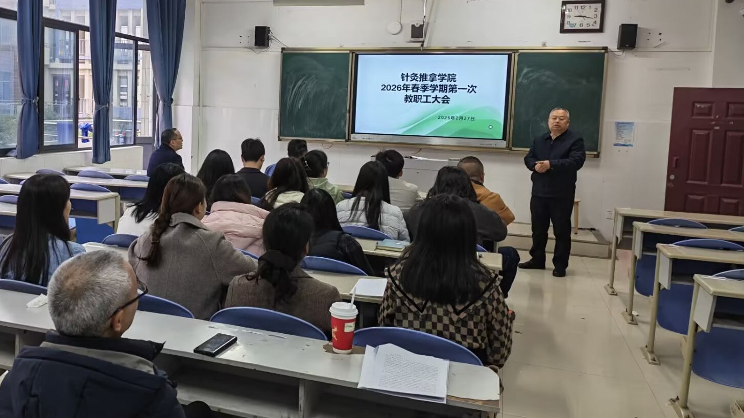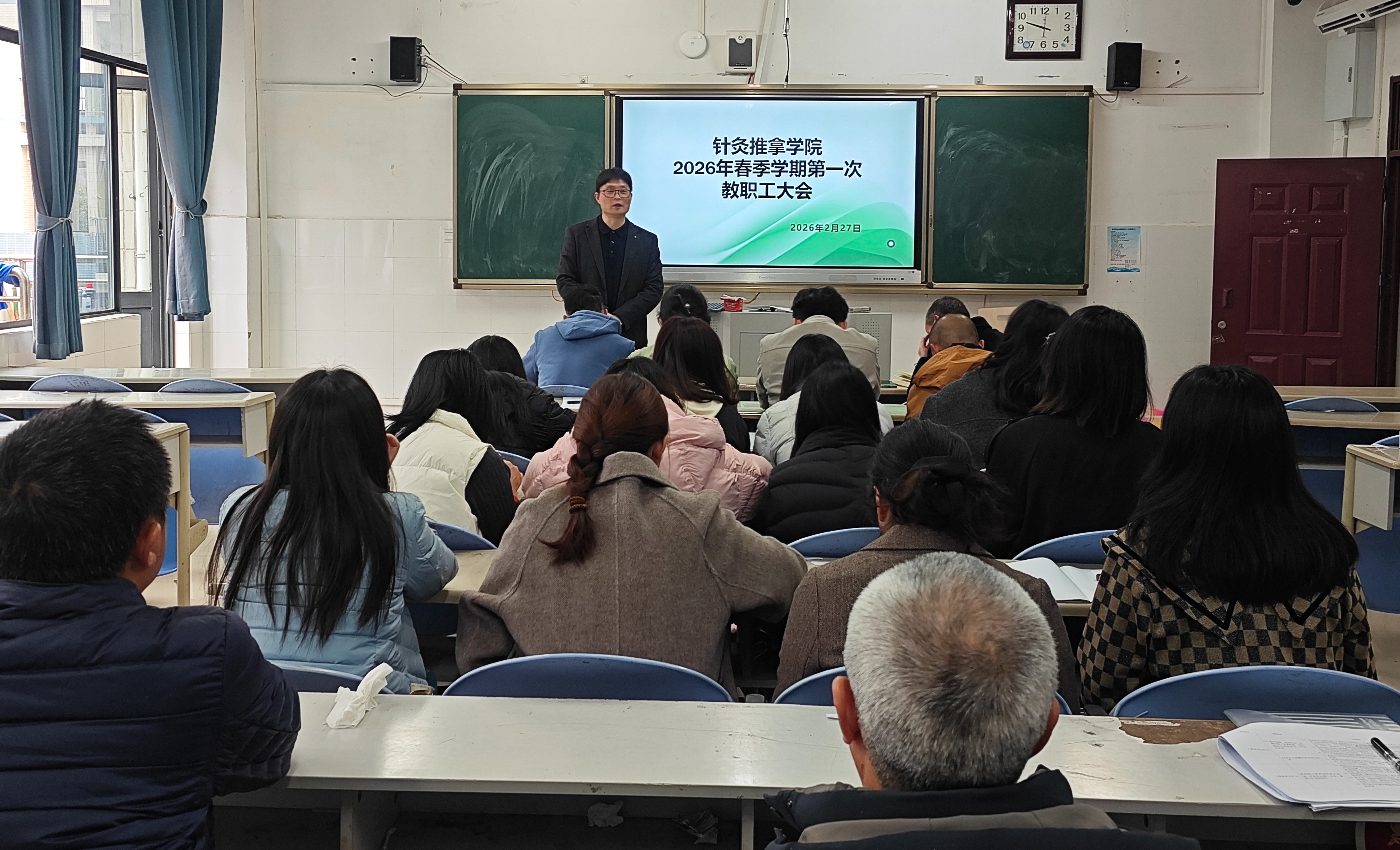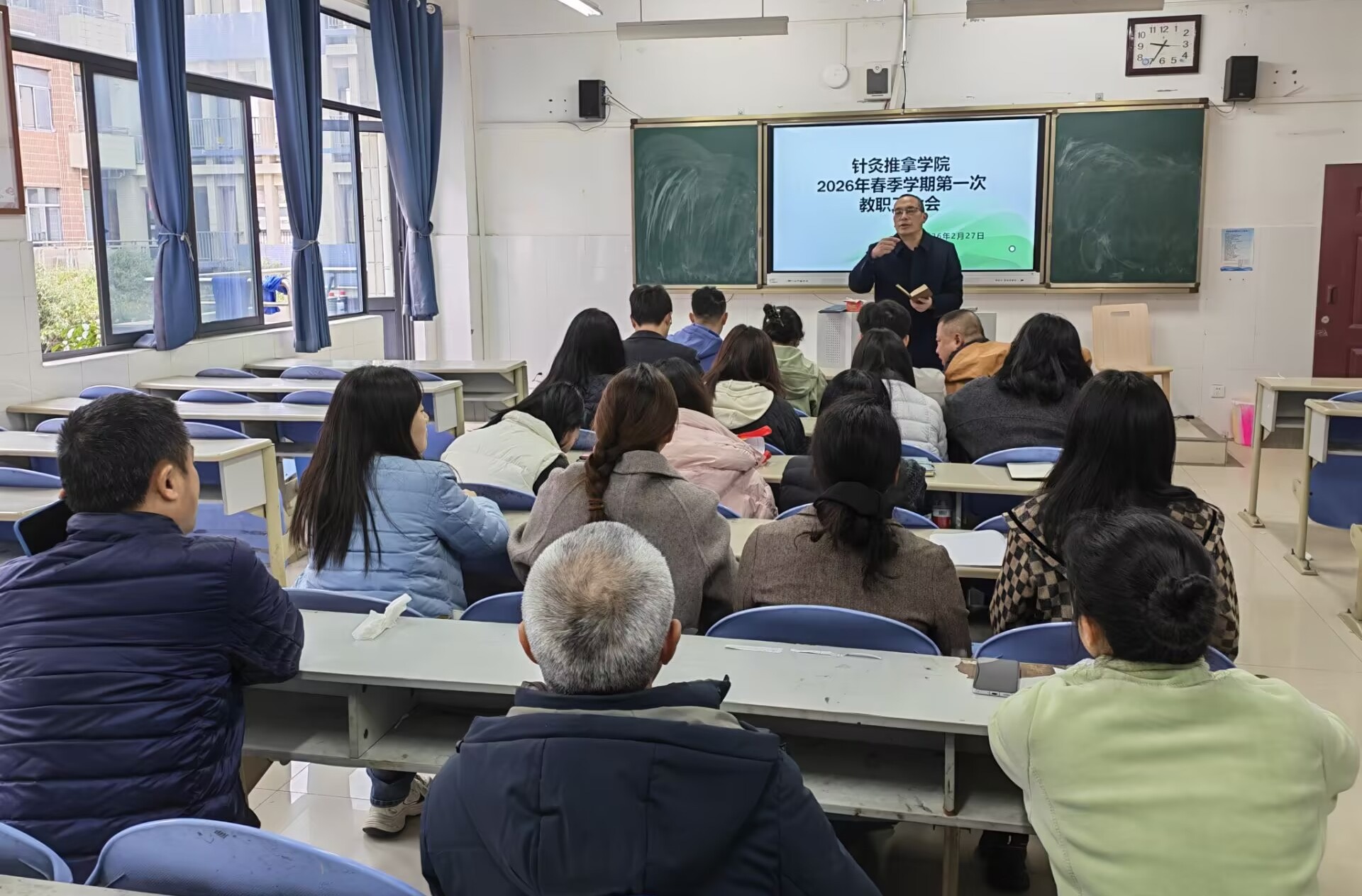 2月27日上午9点,针灸推拿学院在南园6教202召开了新学期第一次全院教职工大会。会议由院长蒋永忠主持,学院全体教职工参加了本次会议。校党委副书记商碧辉莅临会议并作指导讲话。