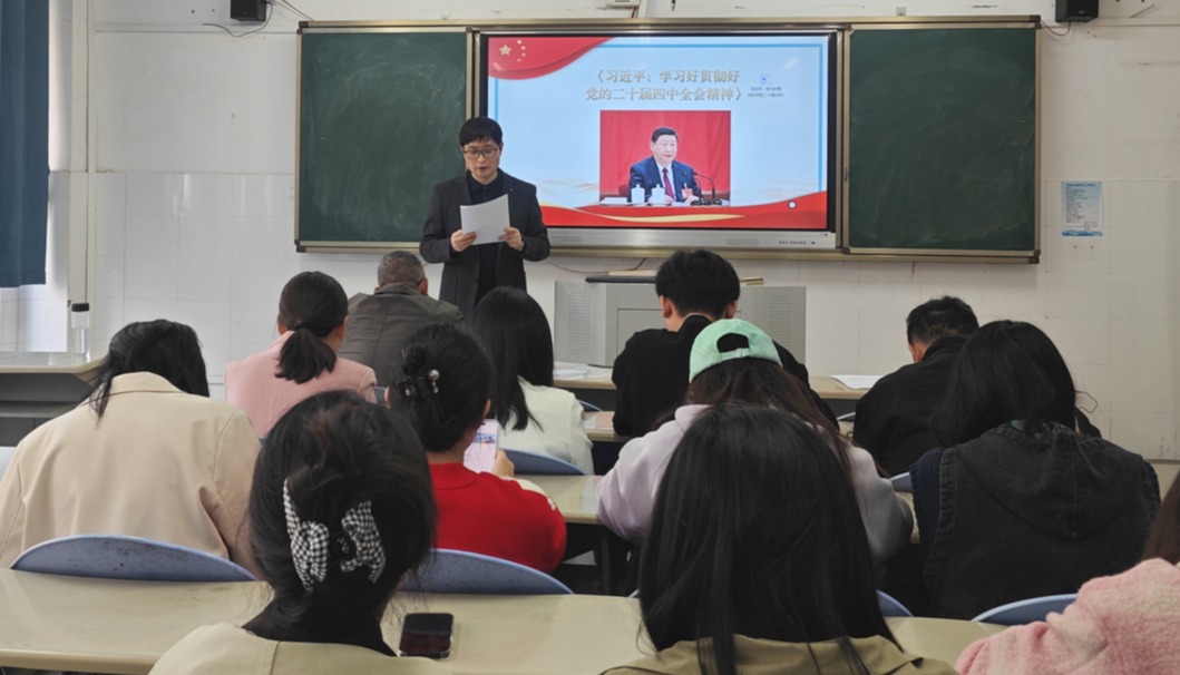 熊华首先领学了《习近平:学习好贯彻好党的二十届四中全会精神》,号召全体党员坚定理想信念、站稳政治立场,始终坚持以人民为中心的发展思想,主动服务学校发展大局。