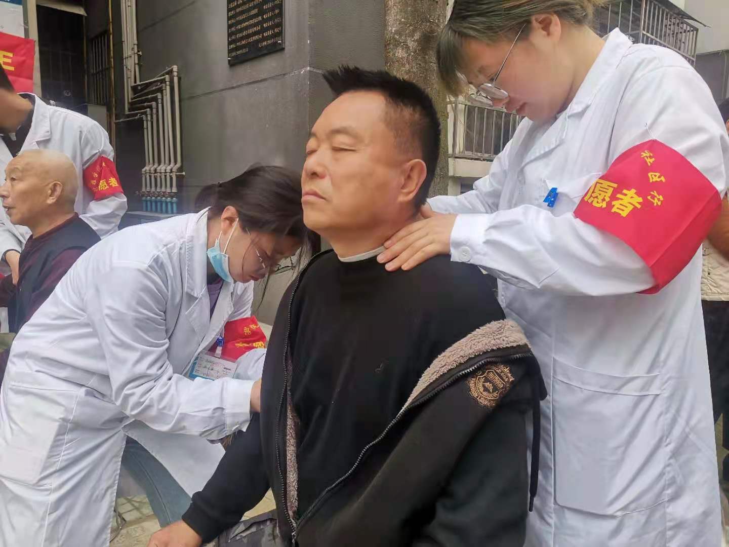 半小时后,志愿者们到达了目的地,在社区负责人的带领下布置好场地,不一会儿路过的老年人纷纷被我们吸引,询问得知答案后,向志愿者投来了认可的眼神,并且很愿意让我们为他们服务,瞬间座无虚席,志愿者们很认真、耐心的为老年人量血压、推拿、按摩、宣讲高血压、糖尿病等疾病预防知识。