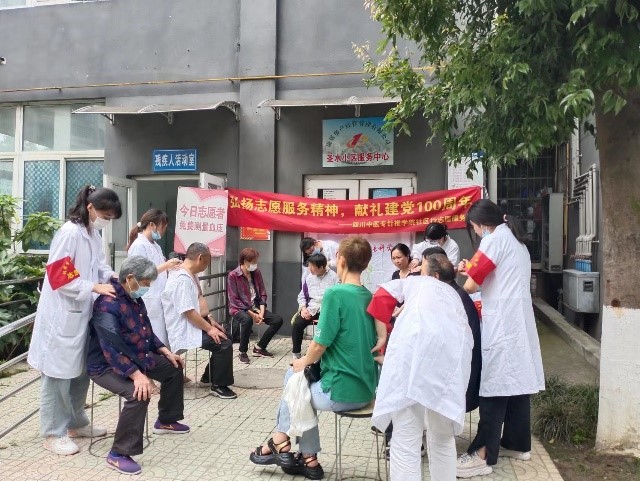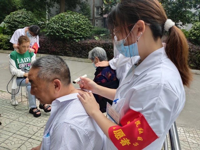志愿者们十分热情地与社区老人们聊天服务,询问大爷大妈们最近有没有什么不适的地方,为他们进行手法按摩、艾灸来缓解疼痛,帮助老人们测量血压,嘱咐他们正确的饮食方法和按时服药。