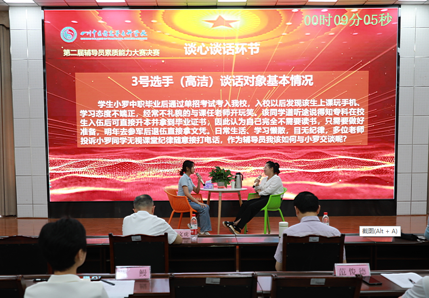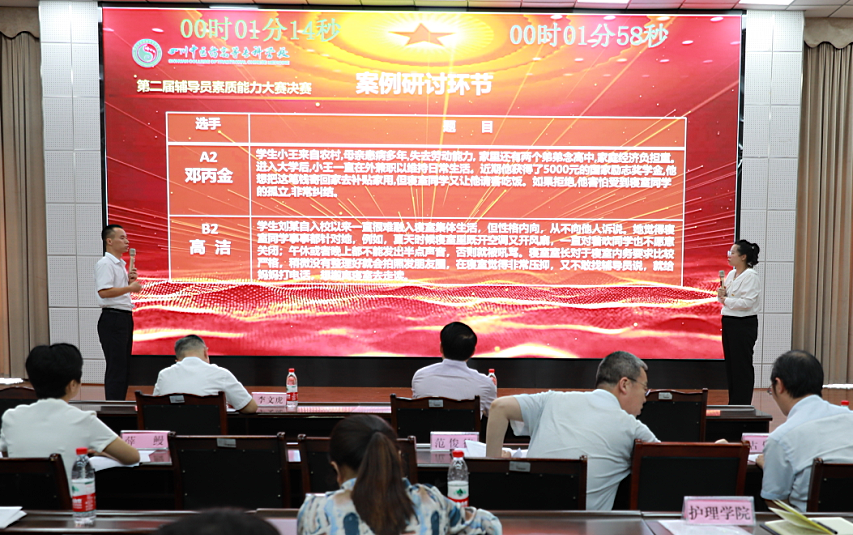本次大赛由四川中医药高等专科学校学工部、人事处、工会承办。赛制结合辅导员的职业标准和工作特点,设置了基础知识测试、案例研讨、谈心谈话三个环节内容,全面考察辅导员的理论素养、业务知识、分析解决问题的能力。