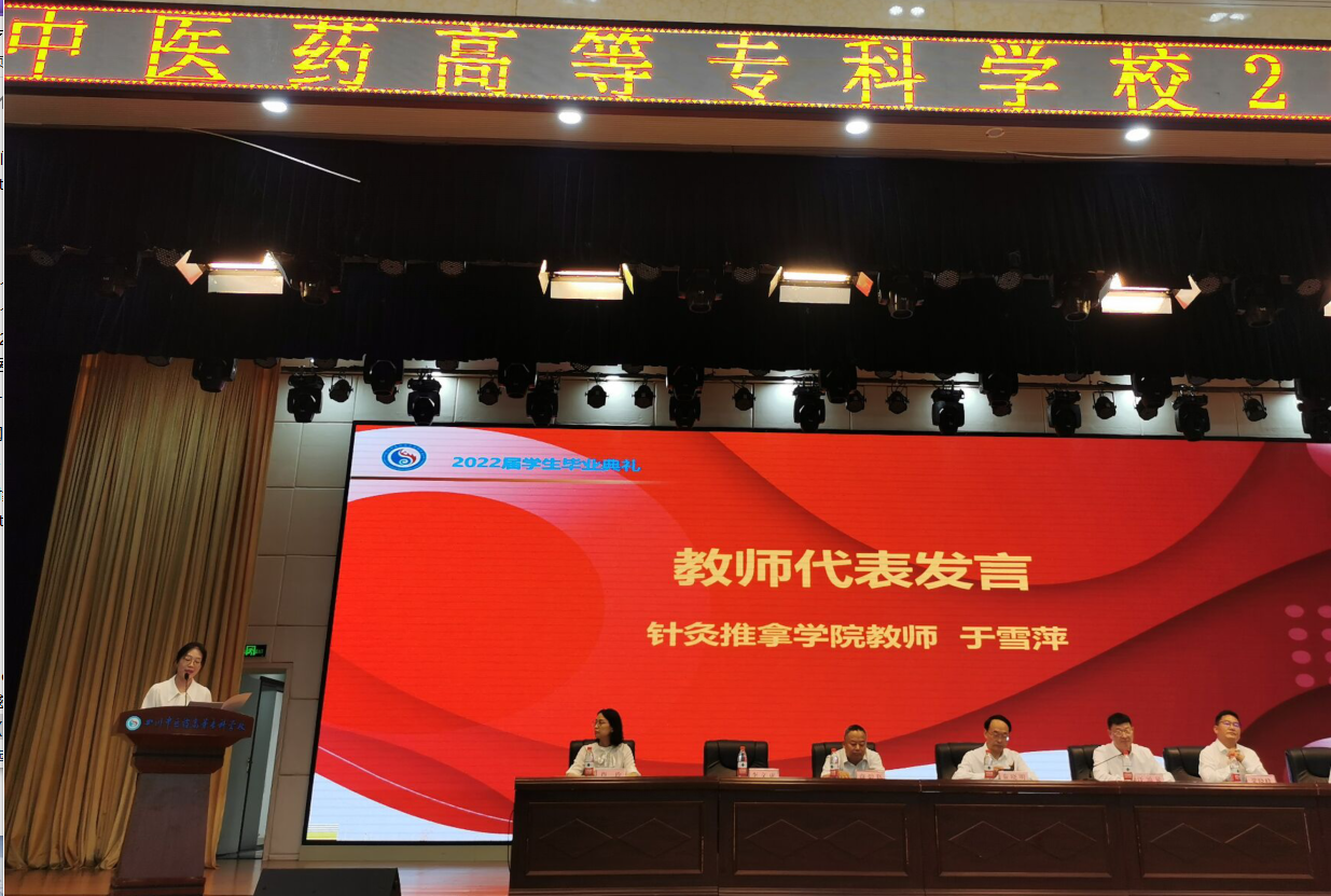 6月是收获的季节,也是新一年的毕业季。24日上午,四川中医药高等专科学校2022届毕业典礼在北区学术报告厅举行。全部校领导、各学院负责人、2022届全体辅导员和毕业生代表参加典礼,我院针灸推拿专业负责人于雪萍老师、省优毕业生王得旭父亲王鹏安分别代表全校专任教师和毕业生家长作代表发言。