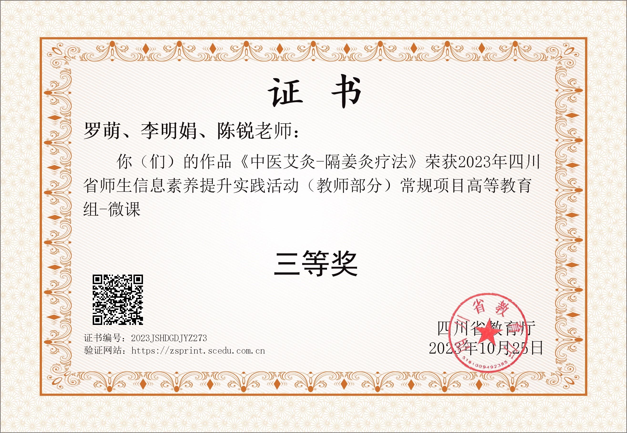 2023年10月25日,在四川省教育厅组织举办的2023年四川省师生信息素养提升实践活动(教师部分)中,由针灸推拿学院罗萌老师、李明娟老师、陈锐老师组成的教师团队表现优异,其作品《中医艾灸-隔姜灸疗法》在高等教育组—微课评选中荣获三等奖。此次获奖充分展示了该团队在中医教育领域的专业素养与教学实力。