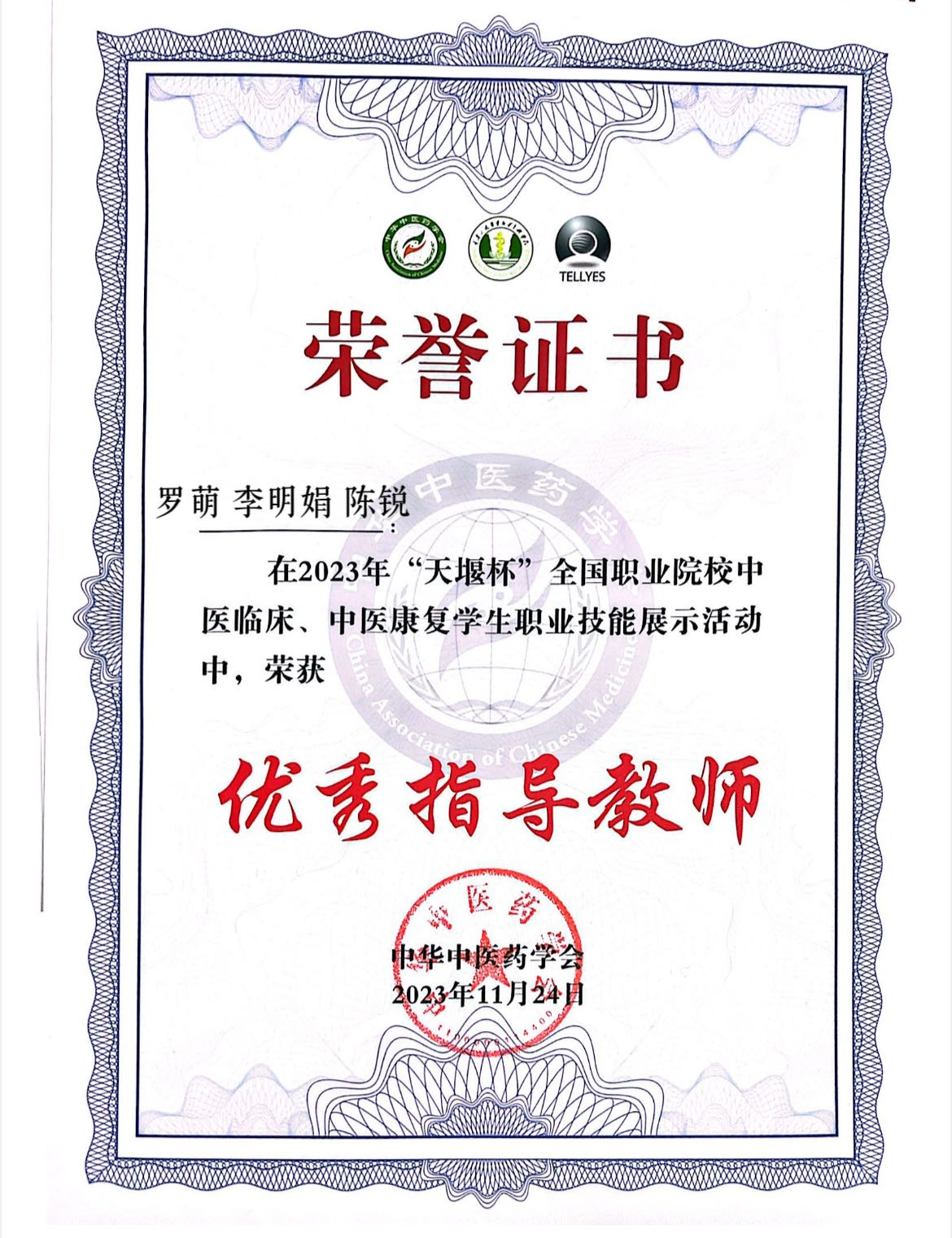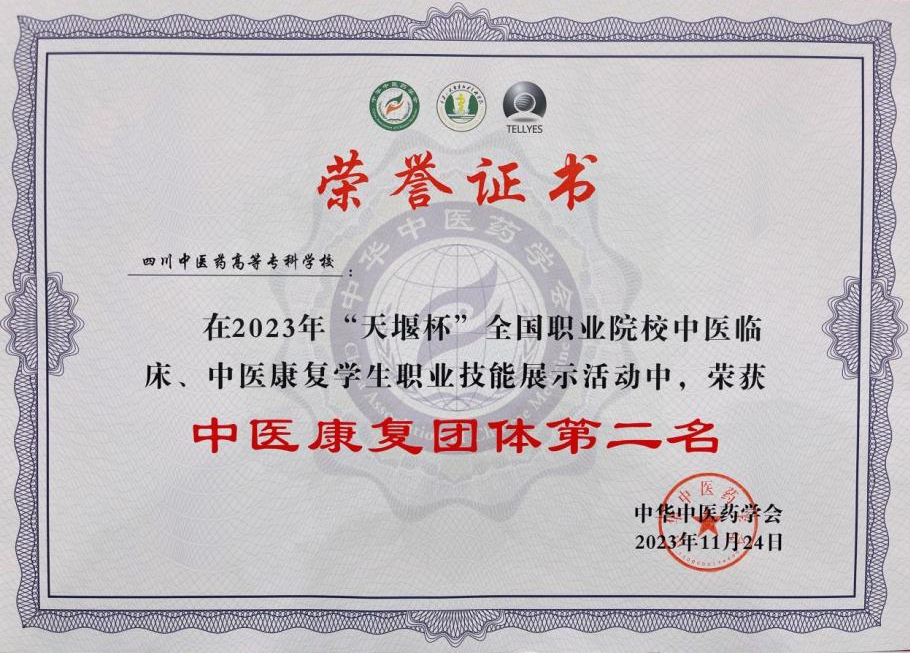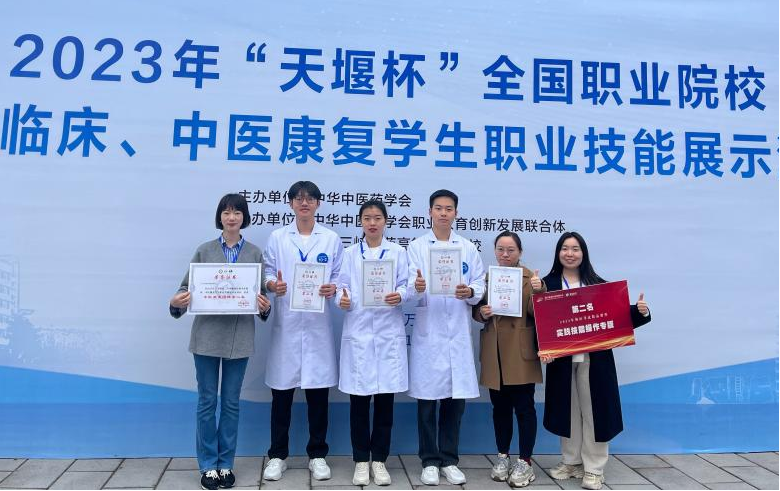 2023年11月24日,在中华中医药学会举办的2023年“天堰杯”全国职业院校中医临床、中医康复学生职业技能展示活动中,我院中医康复技术专业师生获得中医康复团体第二名,其中王晓波同学荣获中医康复理论知识个人单项第二名、中医康复治疗第三名,蔡埼同学荣获中医康复理论知识个人单项第二名、中医康复检查评估个人单项第二名。罗萌老师、李明娟老师、陈锐老师荣获优秀指导教师。