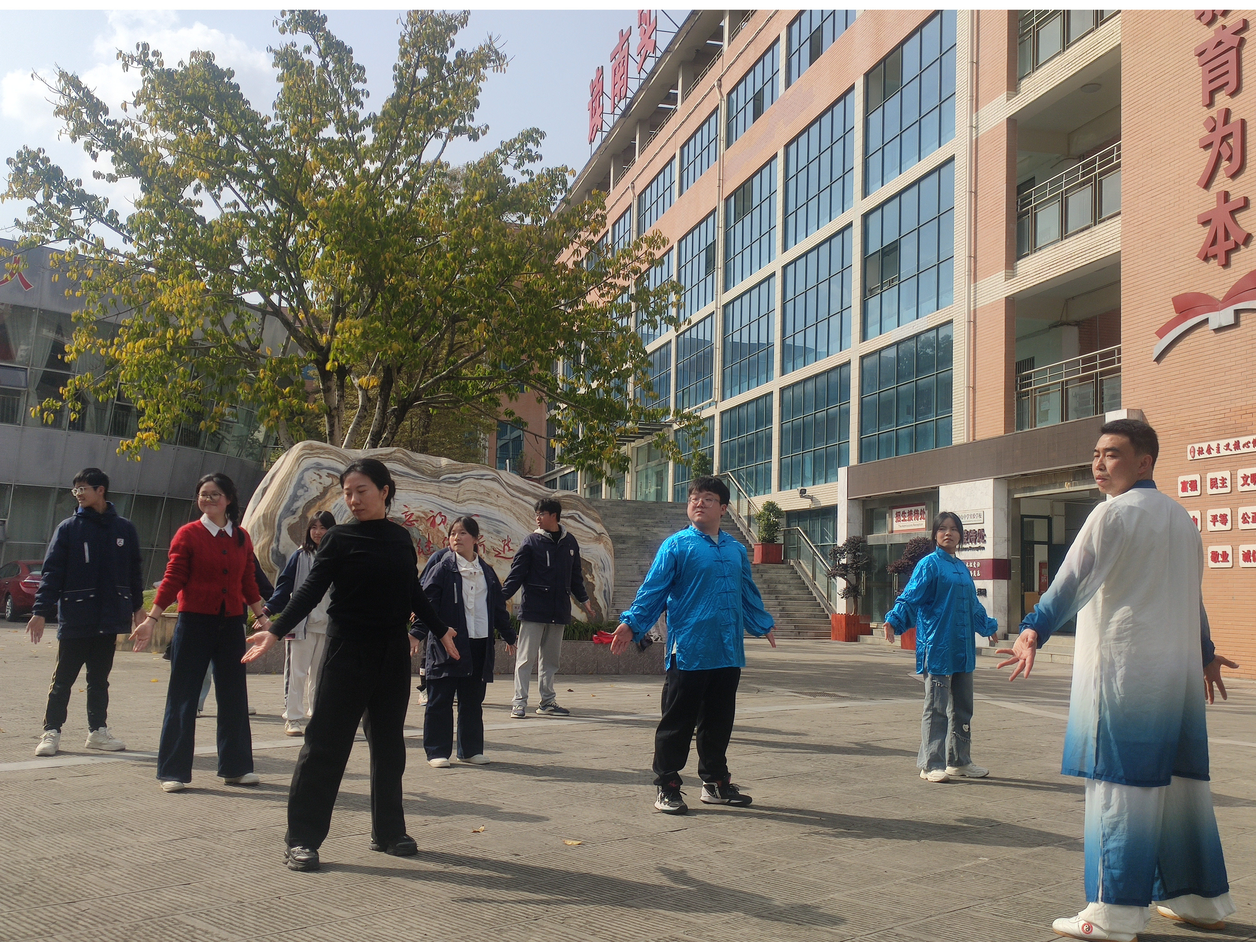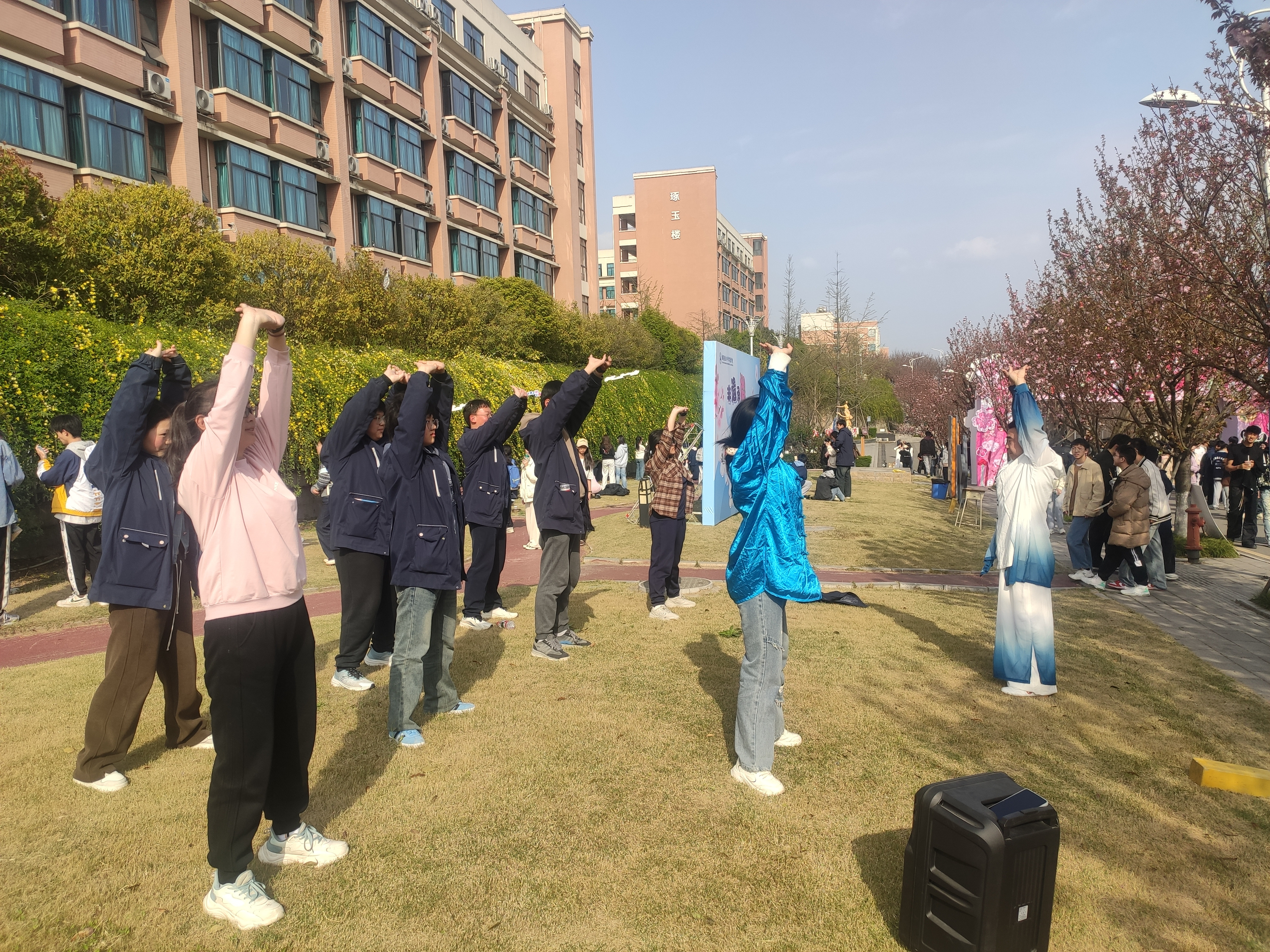 八段锦展示环节,我院师生展开传统功法八段锦的动作分解教学,动作舒展优美,一招一式尽显传统功法的精髓。现场不少同学被八段锦独特的魅力所吸引,跟着口令一起练习,感受传统养生文化的魅力。