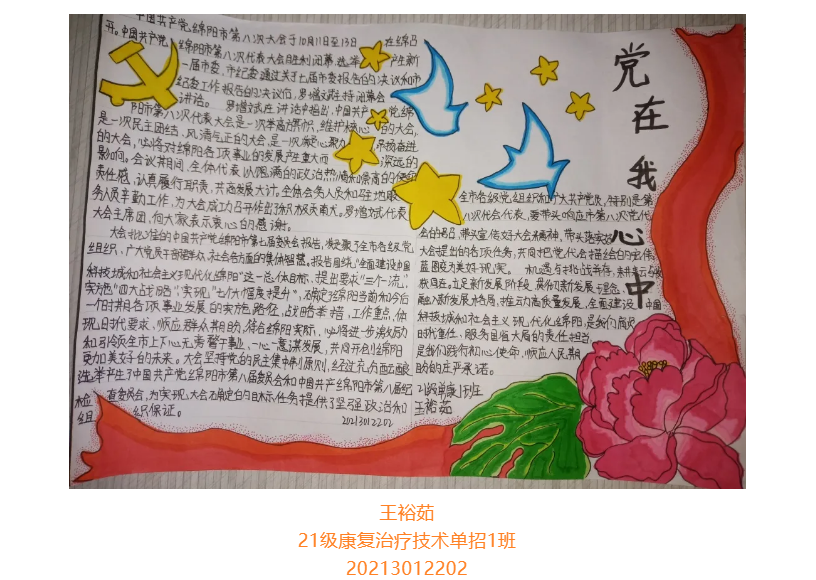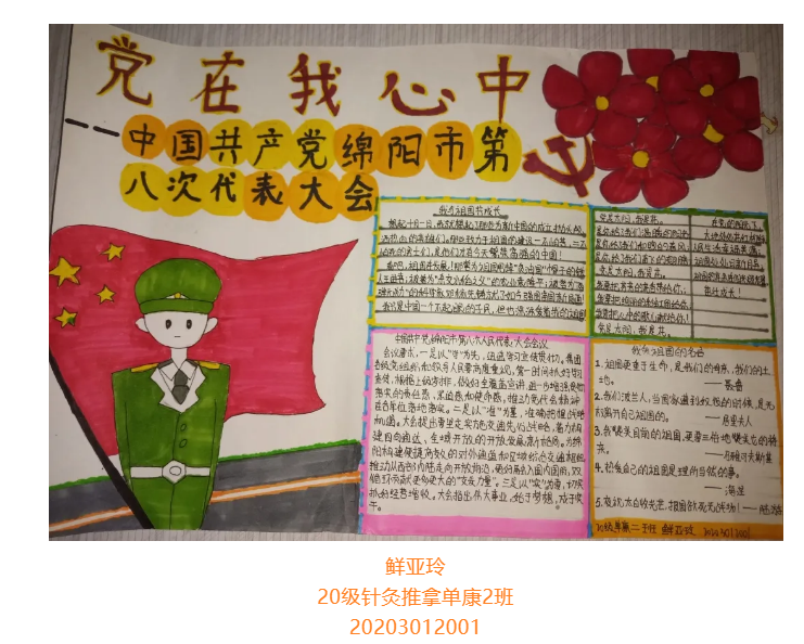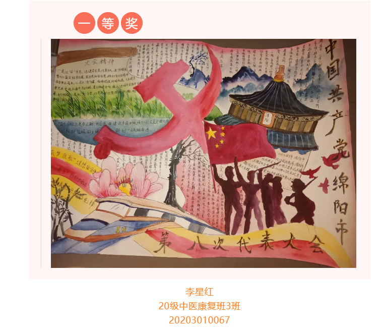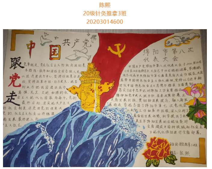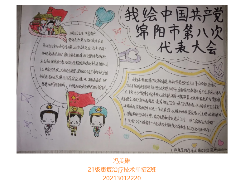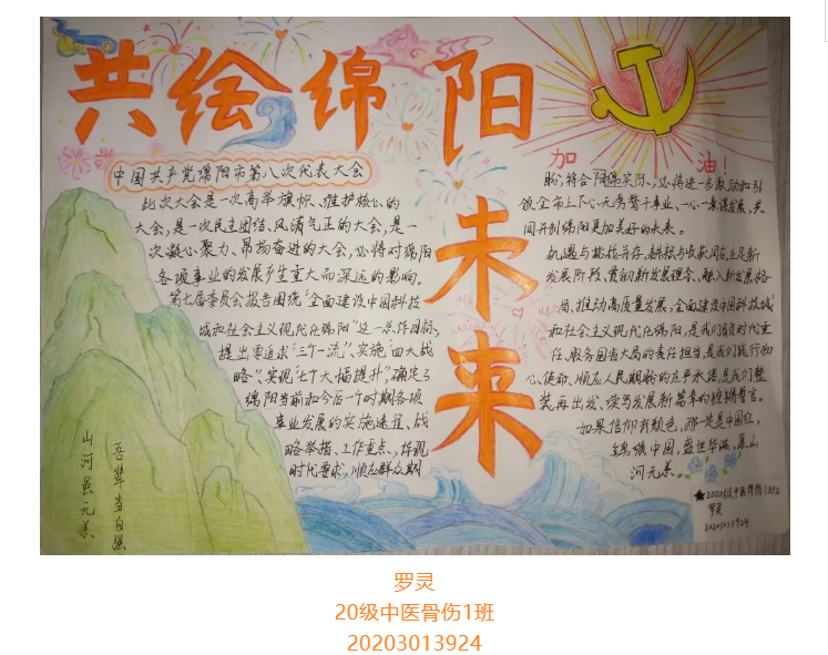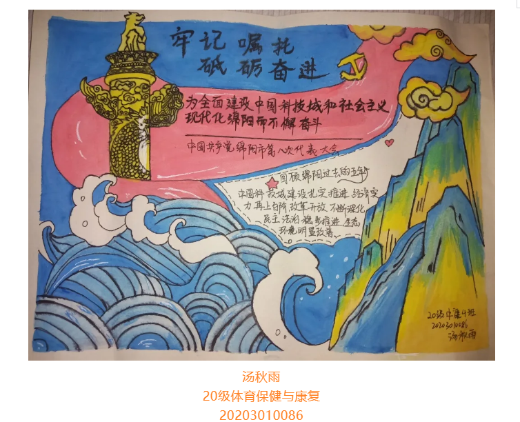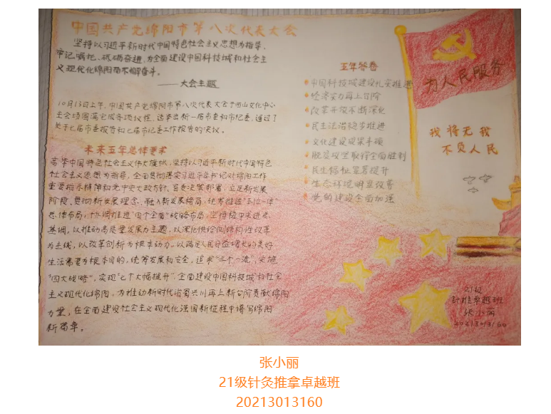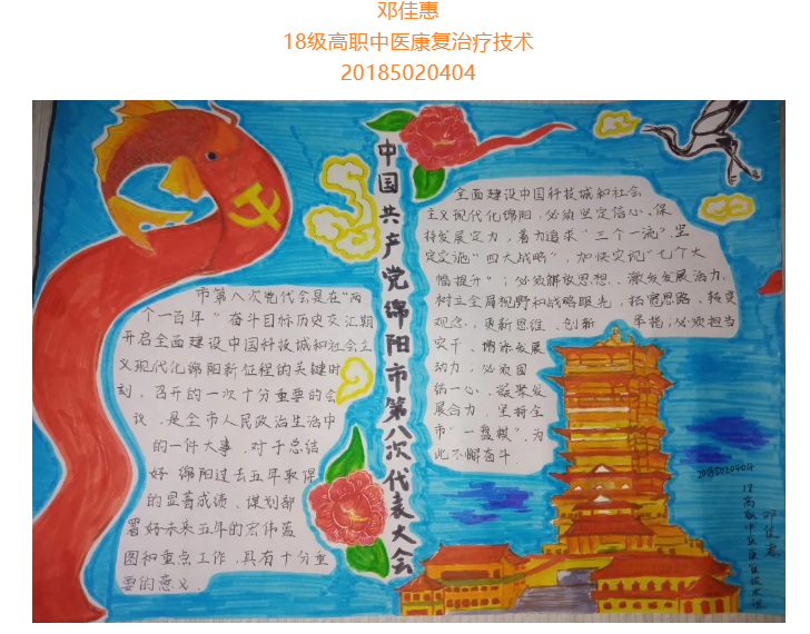 根据省委总体安排部署,经市委研究决定,并报请省委同意,中国共产党绵阳市第八次代表大会于10月11日至13日在绵召开。这次大会是在“两个一百年”奋斗目标历史交汇期、开启全面建设中国科技城和社会主义现代化绵阳新征程的关键时刻,召开的一次十分重要的会议。大会的主题是:坚持以习近平新时代中国特色社会主义思想为指导,牢记嘱托、砥砺奋进,为全面建设中国科技城和社会主义现代化绵阳而不懈奋斗。为更好学习领会中国共产党绵阳市第八次代表大会精神,在师生中掀起学习热潮,中共四川中医药高等专科学校针灸推拿学院总支部委员会举办了“我绘中国共产党绵阳市第八次代表大会”手抄报比赛,同学们踊跃参加,涌现出一大批优秀作品。