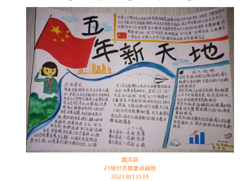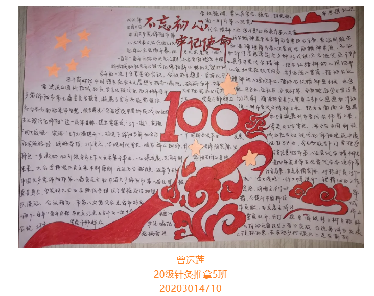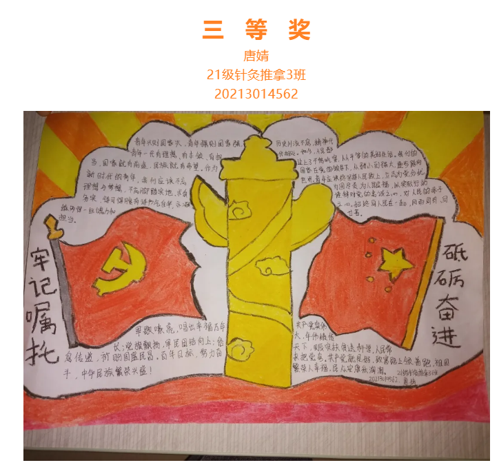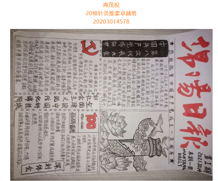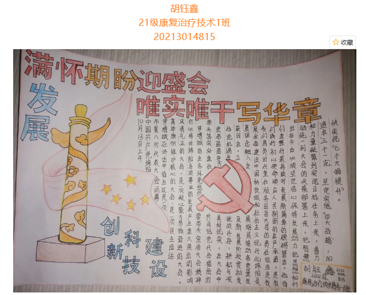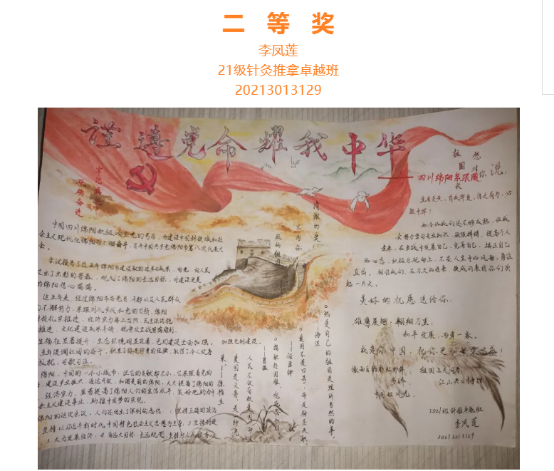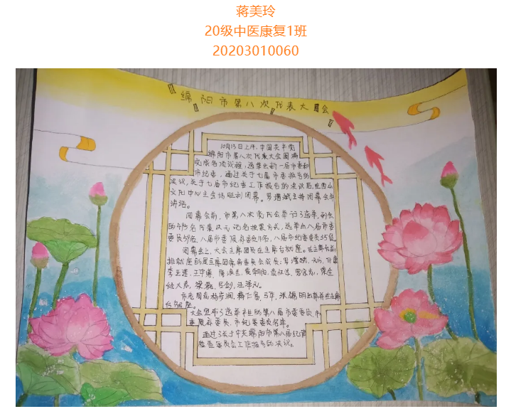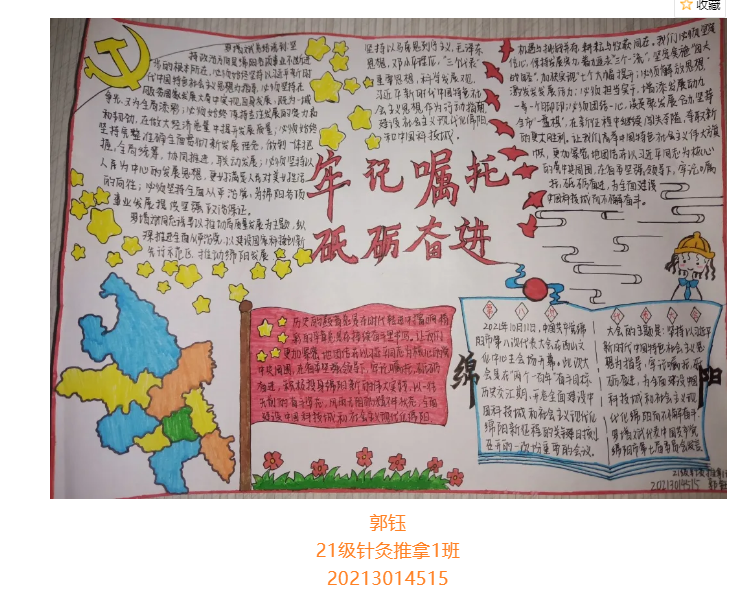 根据省委总体安排部署,经市委研究决定,并报请省委同意,中国共产党绵阳市第八次代表大会于10月11日至13日在绵召开。这次大会是在“两个一百年”奋斗目标历史交汇期、开启全面建设中国科技城和社会主义现代化绵阳新征程的关键时刻,召开的一次十分重要的会议。大会的主题是:坚持以习近平新时代中国特色社会主义思想为指导,牢记嘱托、砥砺奋进,为全面建设中国科技城和社会主义现代化绵阳而不懈奋斗。为更好学习领会中国共产党绵阳市第八次代表大会精神,在师生中掀起学习热潮,中共四川中医药高等专科学校针灸推拿学院总支部委员会举办了“我绘中国共产党绵阳市第八次代表大会”手抄报比赛,同学们踊跃参加,涌现出一大批优秀作品。