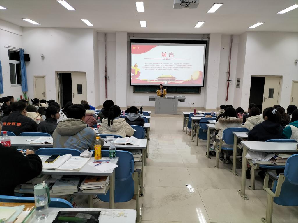 中国共产党第十九届中央委员会第六次全体会议,于2021年11月8日至11日在北京举行。全会由中央政治局主持。中央委员会总书记习近平作了重要讲话。这次全会审议通过了一份特别的“百年总结”——《中共中央关于党的百年奋斗重大成就和历史经验的决议》。2021年12月2日19:00,我院党总支副书记林芝同志带领团学干部和入党积极分子学习中国共产党第十九届中央委员会第六次全体会议公报。