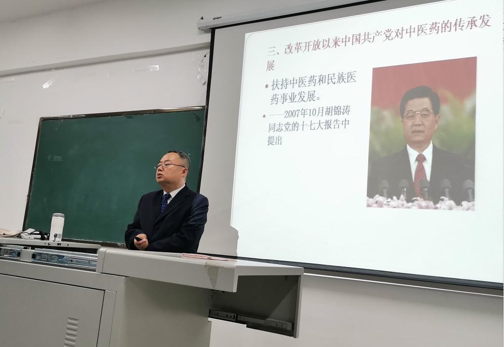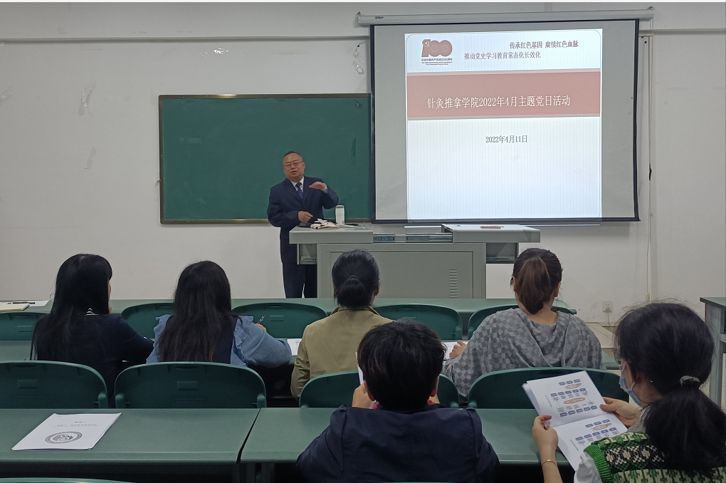 按照学校党委关于党史教育常态化要求,结合近期 “传承红色血脉,厚植大医情怀”校领导讲党史主题活动,4月11日下午4点,针灸推拿学院党总支邀请到我校党委委员、副校长商碧辉同志为党总支全体党员及教师入党积极分子讲授了题名“学史增信推进中医药传承创新发展”的党课。