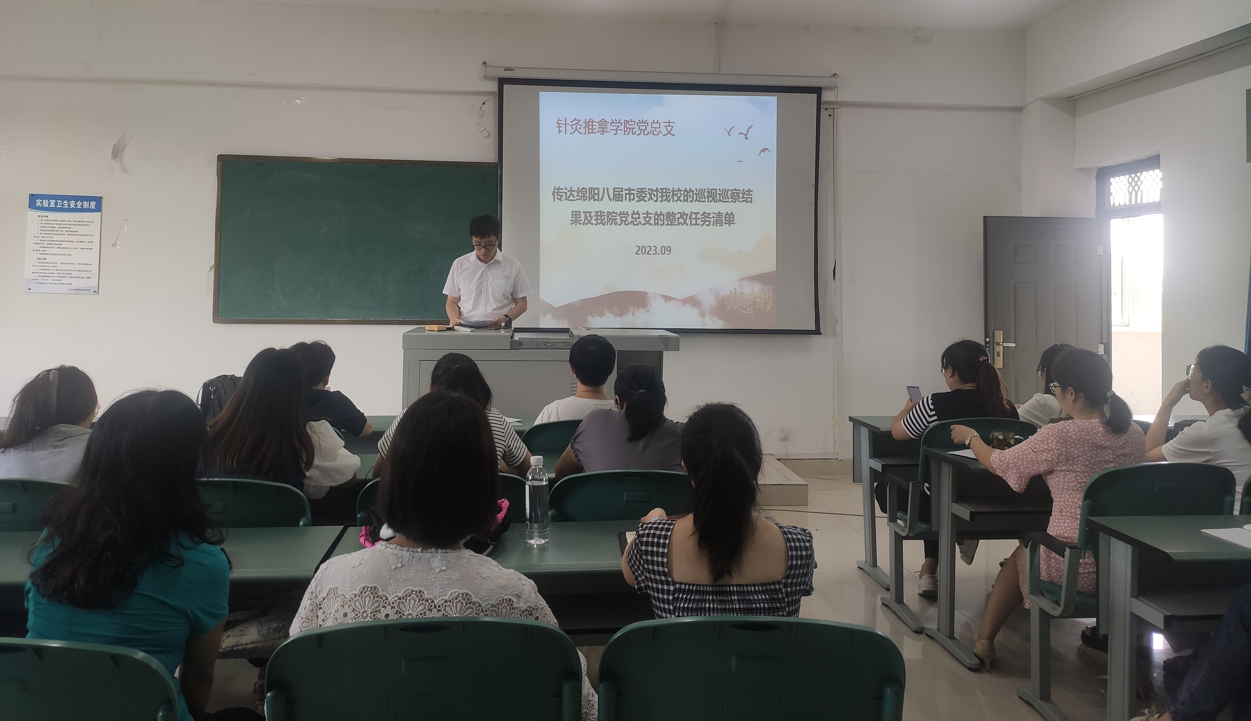 会上,熊华书记传达了绵阳八届市委对我校的巡视巡察结果,通报我院党总支的整改任务清单:由朱霜菊同志担任学院党总支巡察整改工作联络员,定期上报整改工作进度;要求全体党员严格执行“三会一课”和主题党日相关要求,固定学习时间,严格考勤,非必要不请假;进一步丰富学习形式和内容,总支书记和各支部书记每学期至少讲党课1次;严格和规范进行党支部建设,将党建考核与业务考核相互运用,积极进行党建阵地建设; 贯彻党费收缴新要求,所有党员每月以现金形式收纳党费。