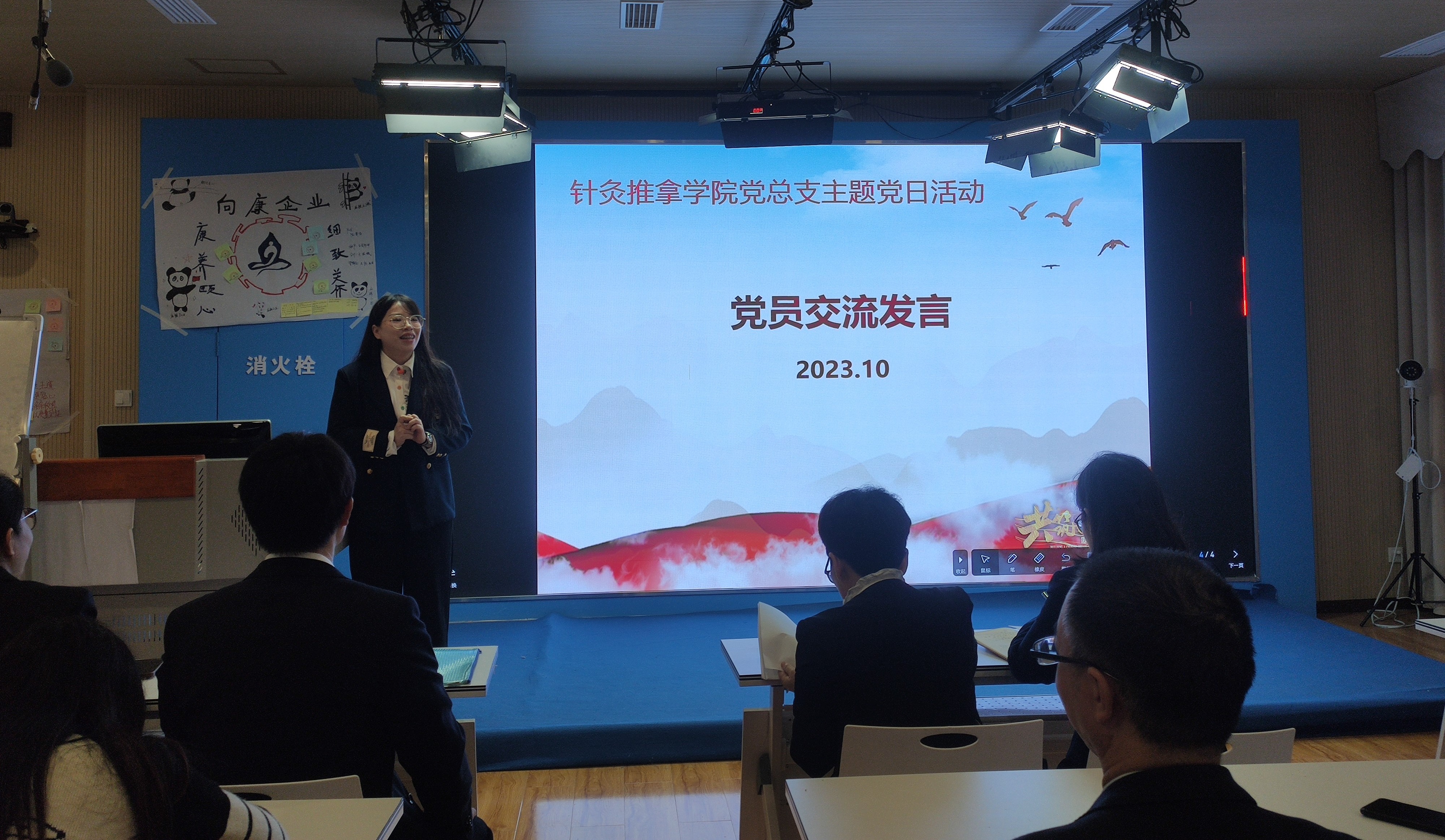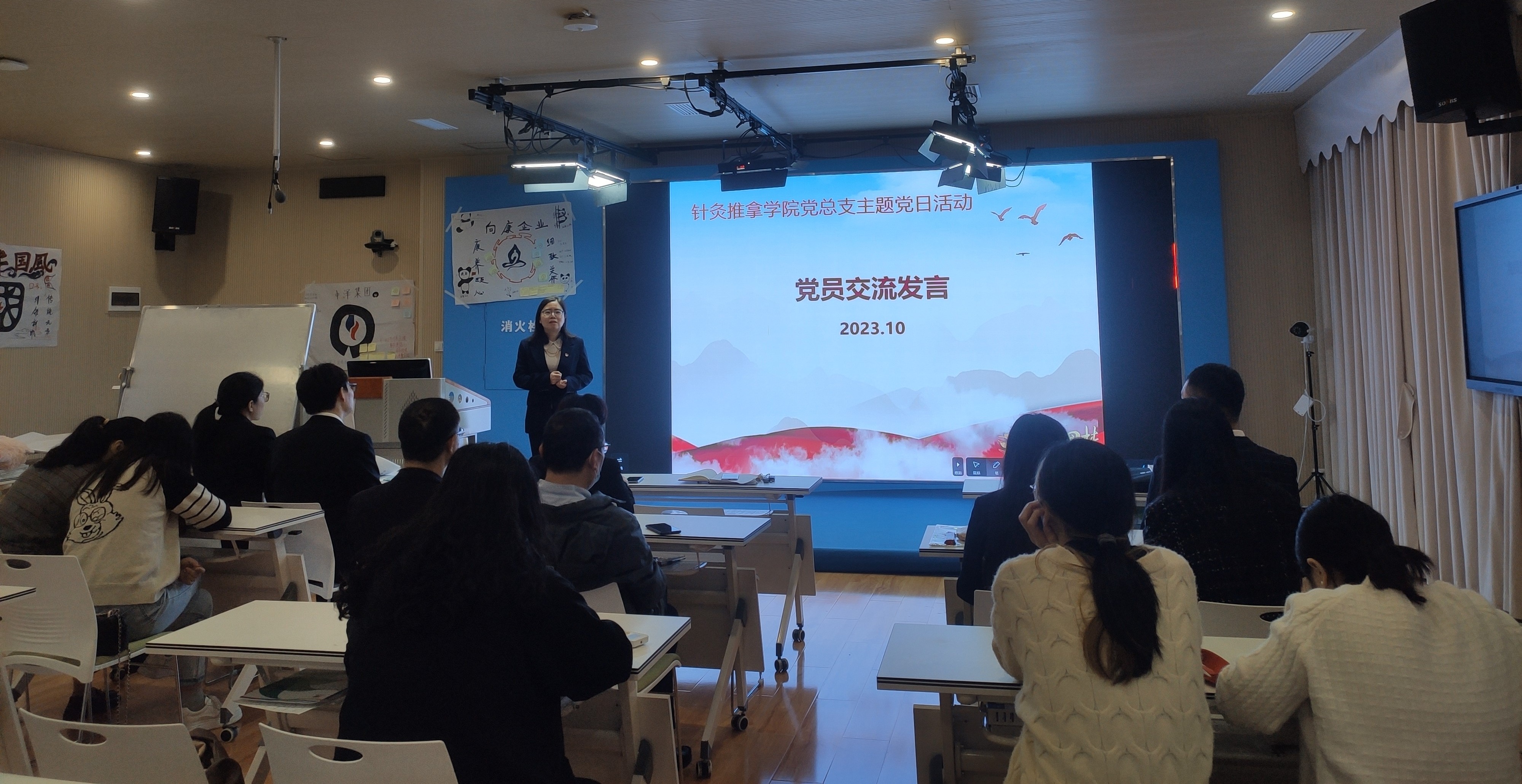 2023年10月18日上午,针灸推拿学院党总支举行全体党员大会暨主题党日活动。党总支书记熊华强调学院党总支将坚持深入学习贯彻习近平总书记重要批示精神,以高度的责任感、使命感和大局观,全心全意为学生服务,培养德智体美劳全面发展的高素质技能型医务工作者。