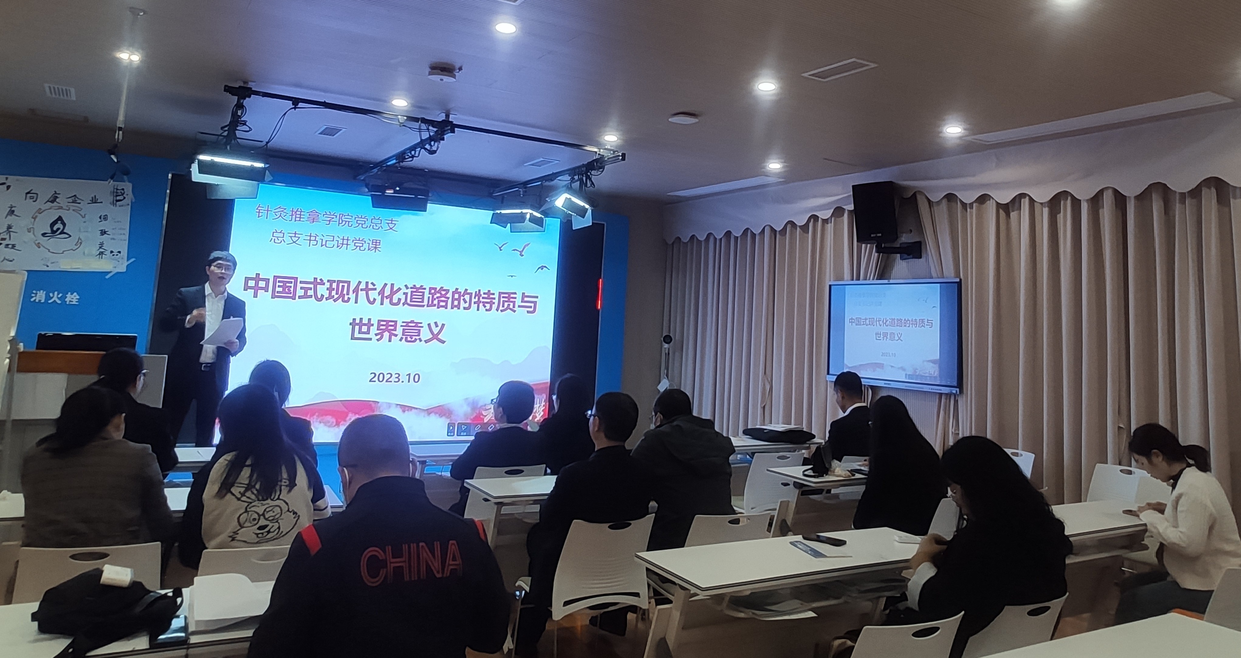 接下来熊华书记对全体党员讲授题为“中国式现代化道路的特质与世界意义”的专题党课。熊华指出对于中国式现代化道路在形成过程中所体现的特质,可以从坚持中国共产党领导,坚持独立自主,坚持并联式叠加发展三个方面来理解和把握,并进一步强调中国式现代化道路的世界意义:中国式现代化道路的形成和拓展,不仅对中国,而且对世界都具有重大意义。拓展了发展中国家走向现代化的途径。中国式现代化道路,摒弃了西方以资本为中心的现代化、两极分化的现代化、物质主义膨胀的现代化、对外扩张掠夺的现代化老路,拓展了发展中国家走向现代化的途径,为人类对更好社会制度的探索提供了中国方案。