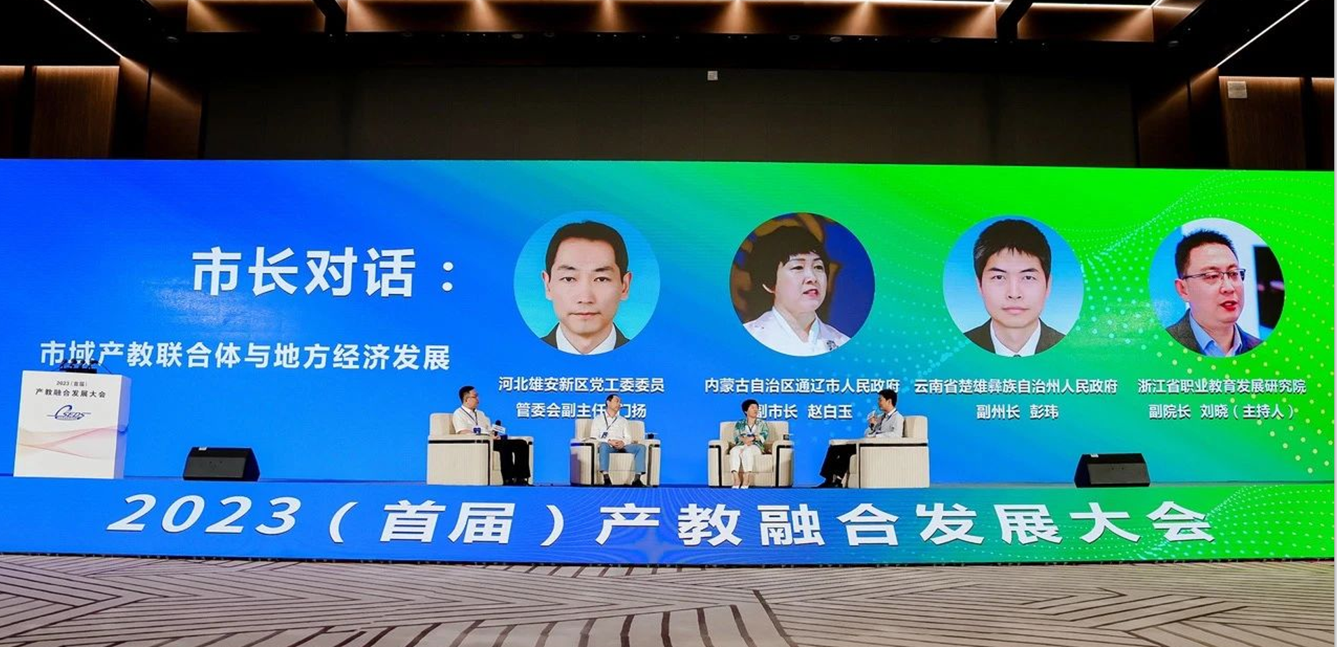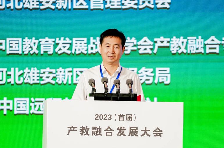 40余家机构分享经验,100篇典型案例结集出版,485项实践成果集体呈现……一连串数字凝聚了产教融合领域的智慧和精华,也预见了产教融合的光辉未来。2023(首届)产教融合大会由中国教育发展战略学会、河北雄安新区管理委员会主办,以“洞见·破局·新发展——以产教融合促进经济社会和人才高质量发展”为主题。国家发展改革委社会发展司原司长欧晓理、教育部职业教育发展中心副主任曾天山作主旨报告,深圳职业技术学院许建领校长,中铁国资资产管理有限公司王彦飞副总经理作专题报告。教育部职业教育与成人教育司二级巡视员、教育部继续教育办公室主任刘英,雄安新区党工委委员、管委会副主任门扬,内蒙古自治区通辽市人民政府副市长赵白玉,云南省楚雄彝族自治州人民政府副州长彭玮,中国教育发展战略学会产教融合专业委员会理事长、清华大学继续教育学院党委书记刁庆军,以及多地政府部门、教育行政部门,全国各高校、职业院校、行业企业代表,中央媒体700余人参加大会。