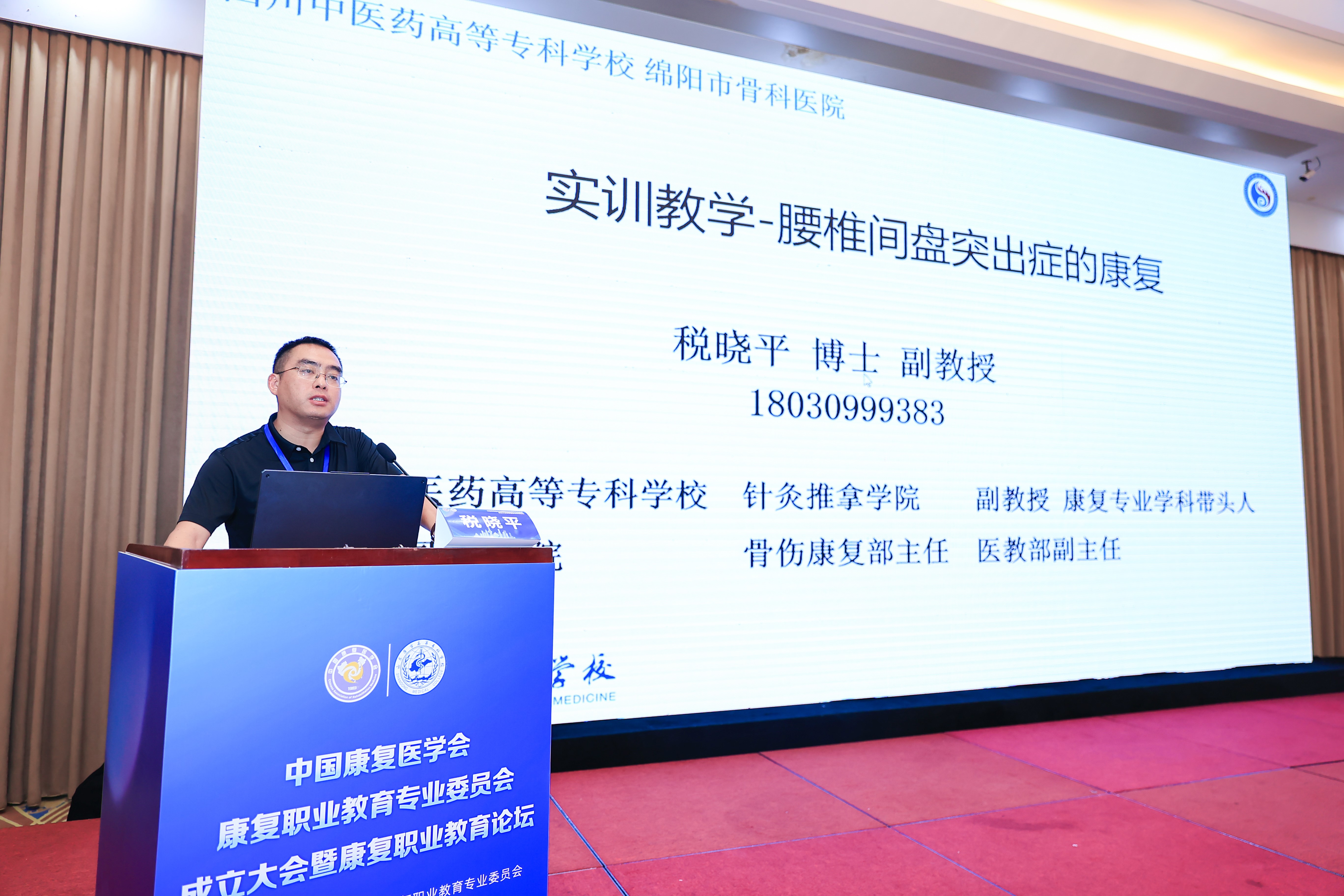 我院康复教研室税晓平博士、副教授围绕康复治疗技术专业的教学标准、产教融合和技能竞赛作了专题报告,介绍我校在康复治疗技术专业建设中的经验。